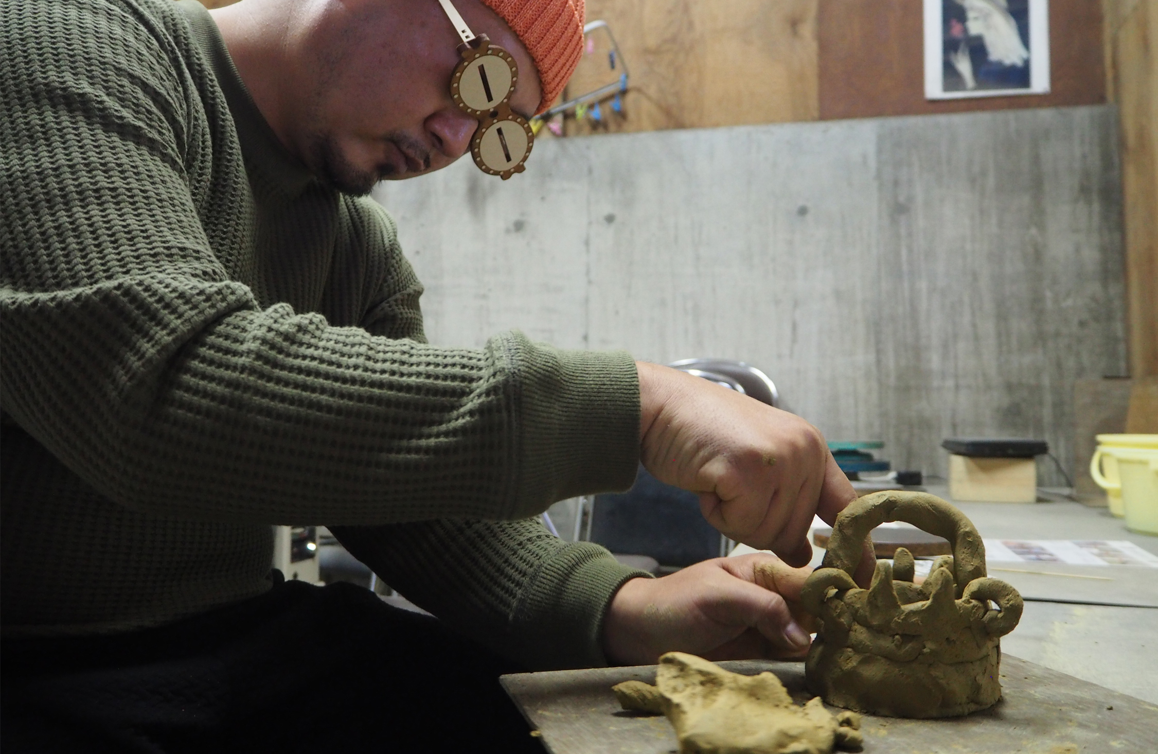 僕は、縄文気分を盛り上げようと事前にネットで購入していた遮光器土偶メガネを装着。スタッフさんに苦笑されながら粘土をこね始めて気が付いた。
