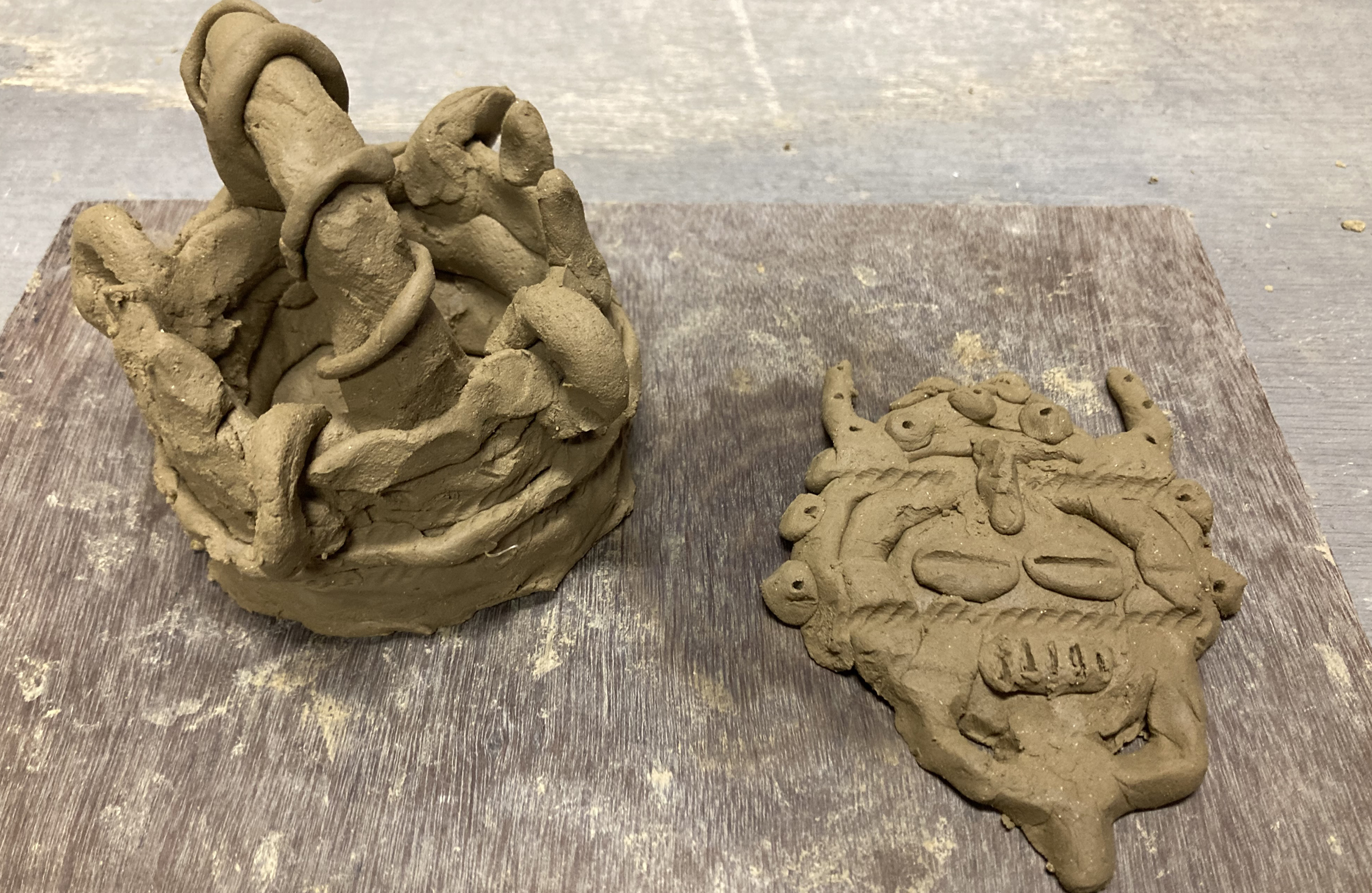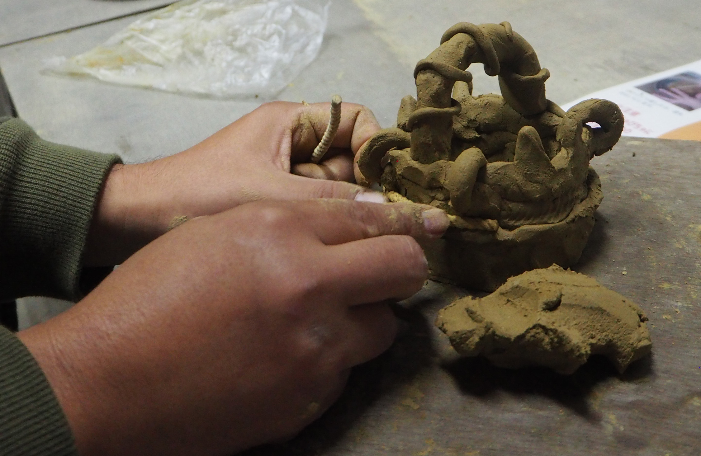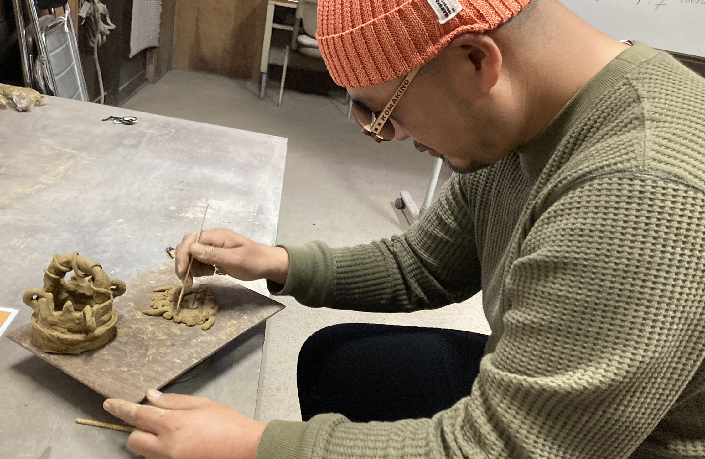 粘土でなにを作ってもいいという状況って、小学校以来じゃないか? 硬くもなく、柔らかすぎもしない粘土はしっとりしていて気持ちいい。思いつくままに、取っ手のついた器のようなものを作った。スタッフさんに「縄文土器っぽい!」と褒められ、テンションが上がる。