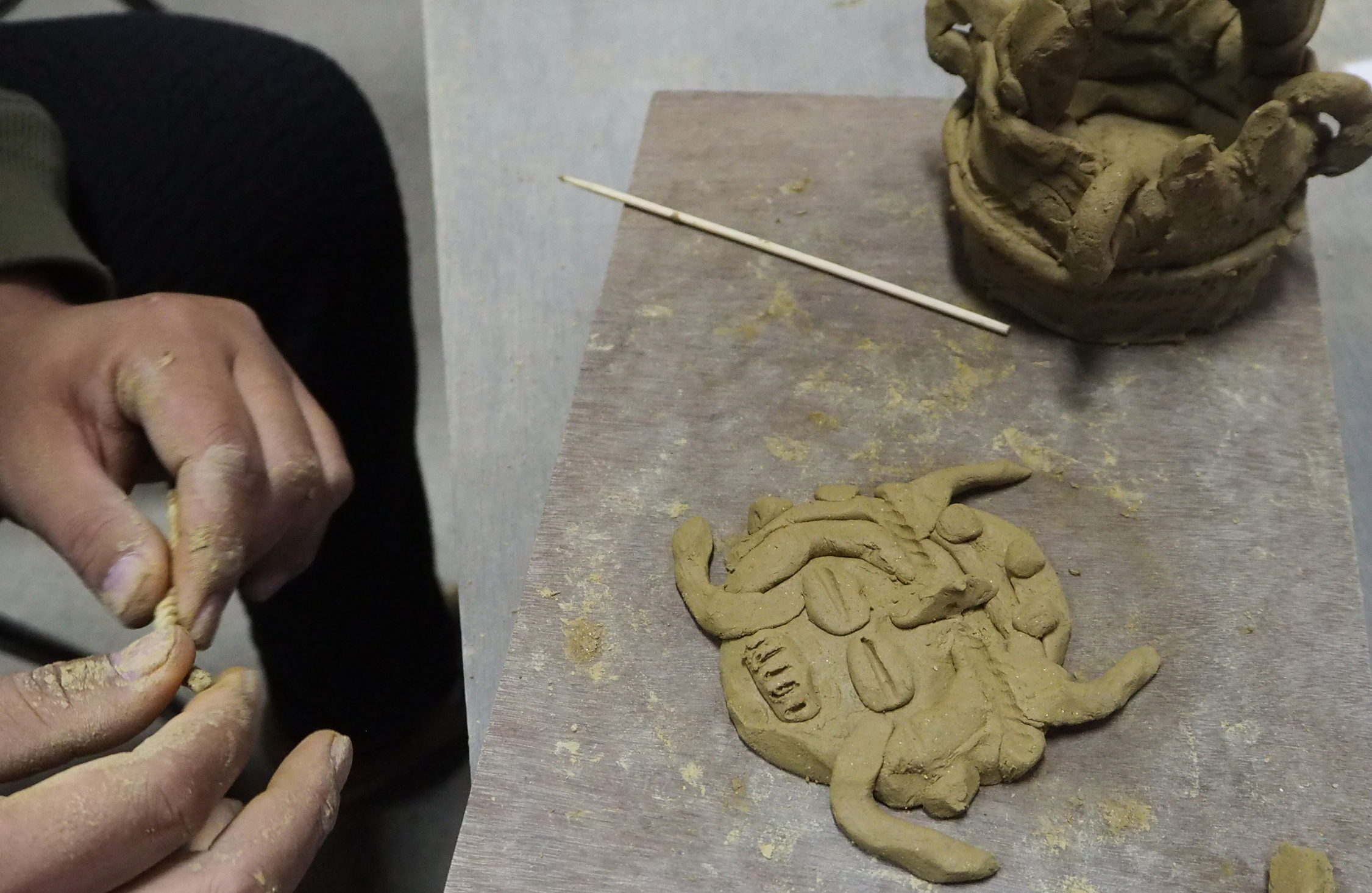 次は、土偶。土偶ってこんな感じだっけ? と適当に作っていたら、だんだん別物になっていった気がするけど、お構いなし。最初に土偶を作った縄文人だって、楽しみながら自由に作ったに違いない。竹串を使って模様をつけたりしていたら、土偶っぽくなった気がした。
