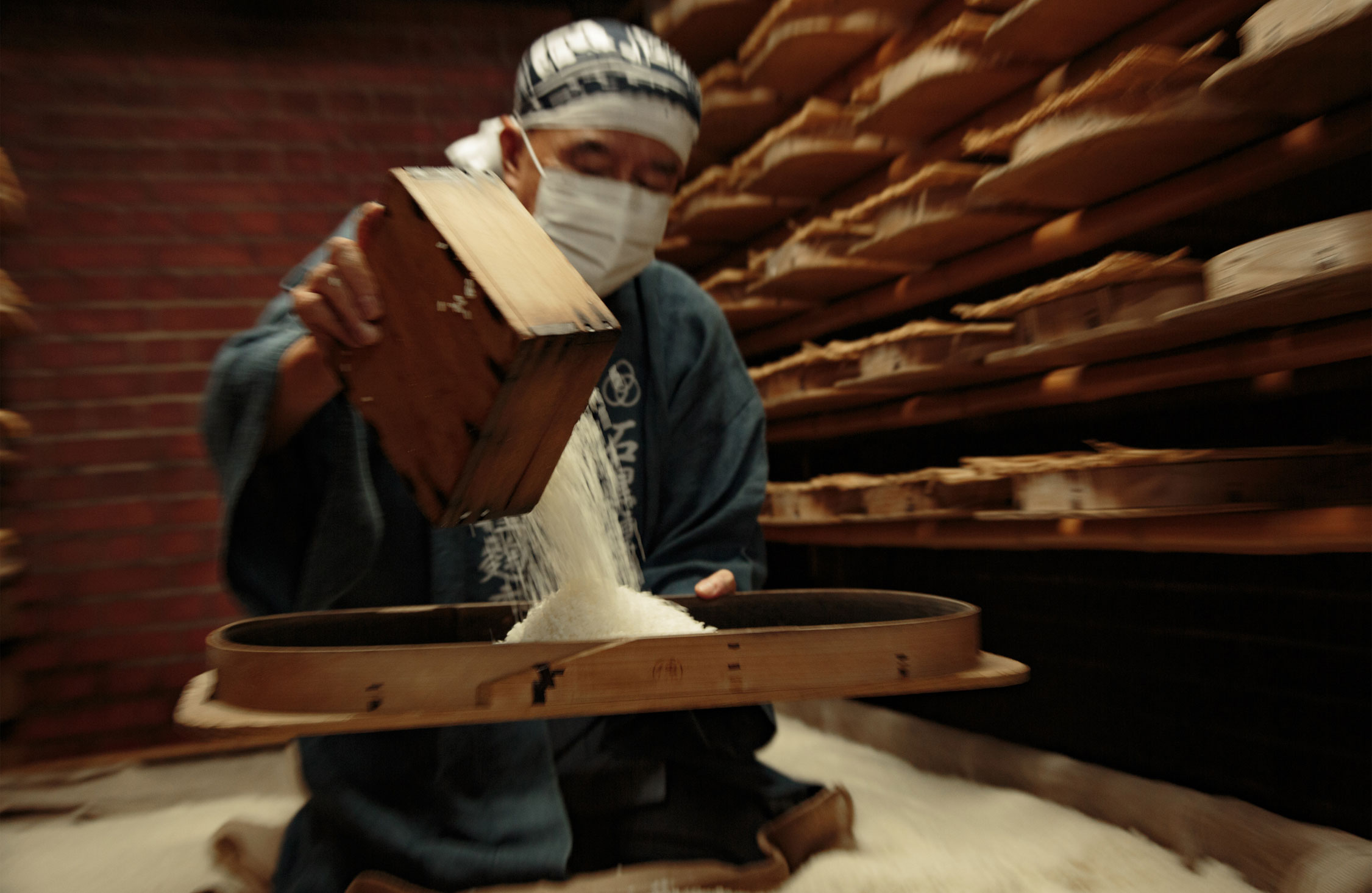 この種麹を蒸して冷ましたお米に振りかけ、こうじ蓋と呼ばれる薄い板のようなものの中にならしていく。麹菌が空気に触れるように2〜3センチの厚みで平たくしていくことで、力の強い麹ができあがるという。