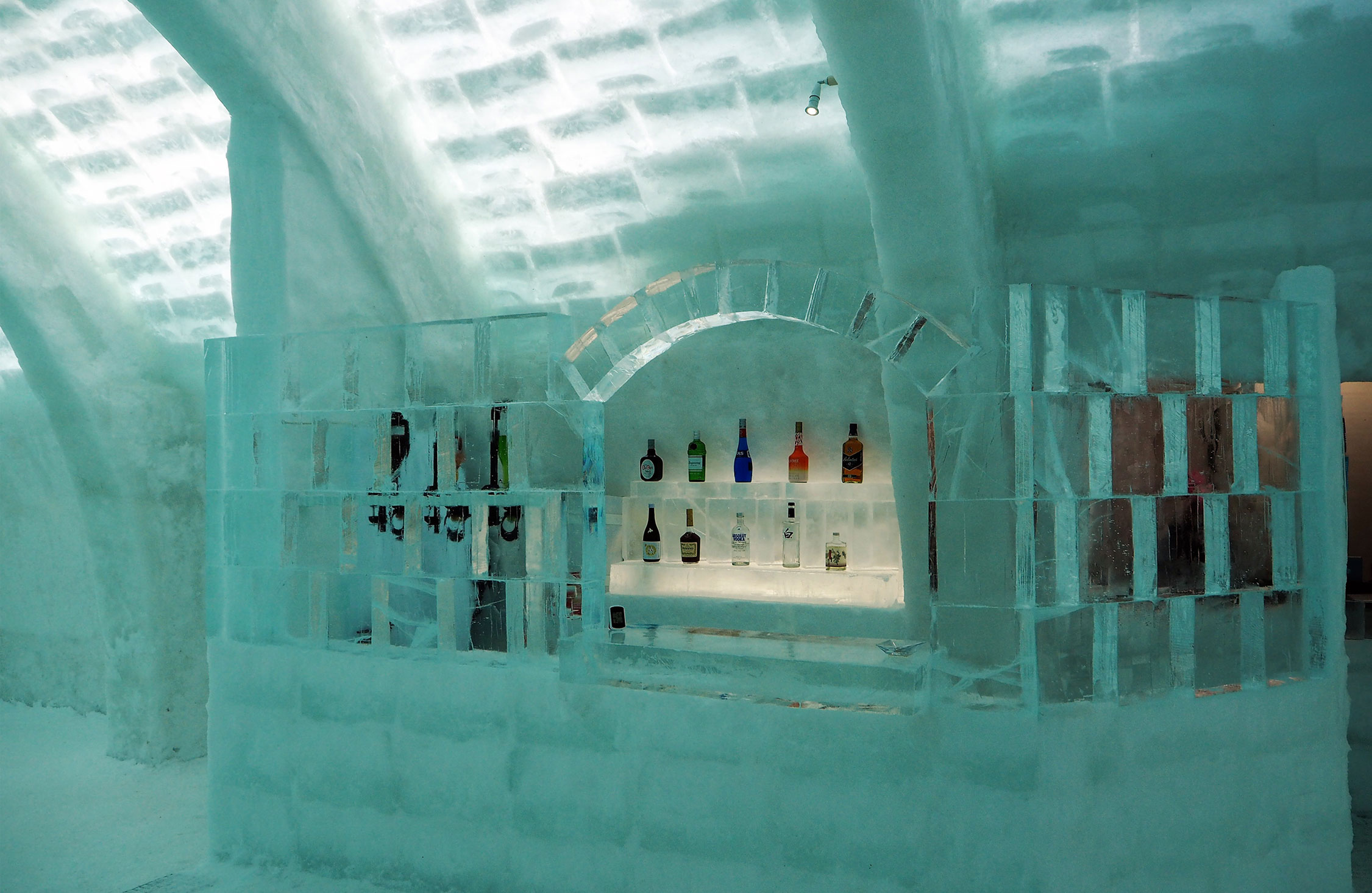 アイスバーの店内は、雪と氷のブロックだけで作られているとは思えないほど手の込んだ内装でビックリ! モコモコに着込んだスタッフさんが3人いたので、「ここは日本一寒い職場かもしれませんね」と尋ねると、「このなかは、外よりも暖かいんですよ」と素敵な笑顔で、こちらのハートもホットになる。