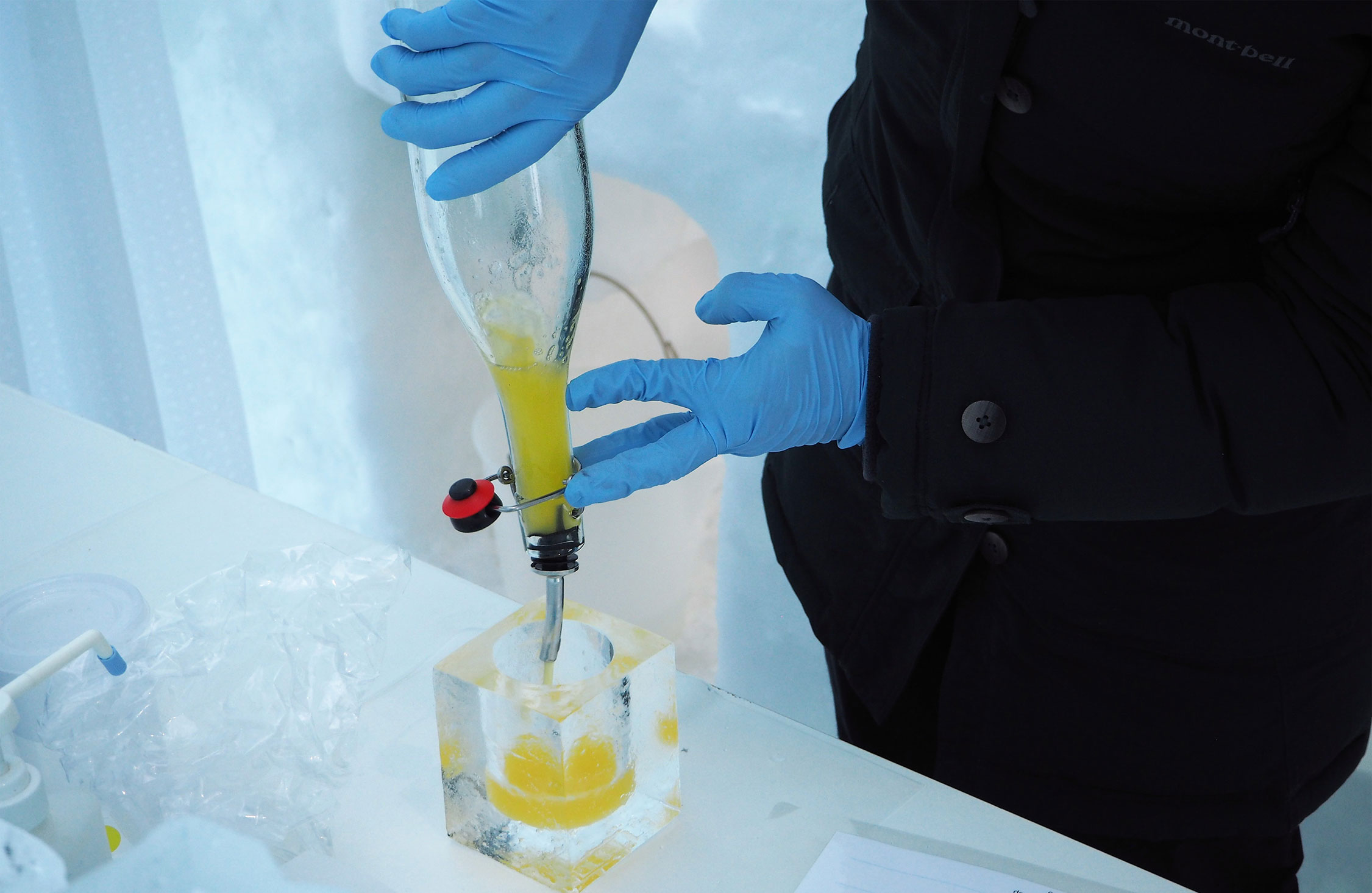 メニューを見ると、お酒はもちろん、ホットドリンクも充実している。なんとなくイベント的に作られた場所ではなく、ここは紛うことなきバーだ! 僕はオリジナルカクテルを注文し、氷でできたグラスに入れてもらった。