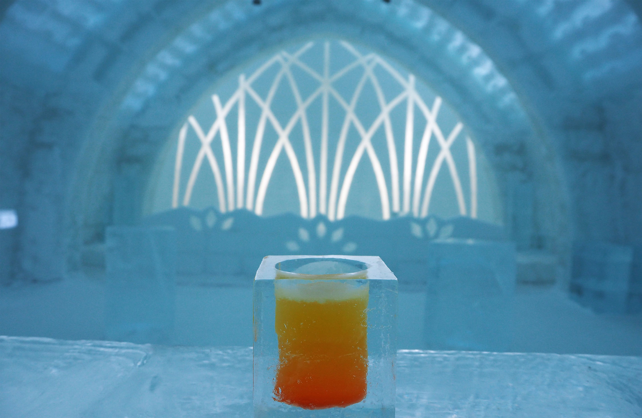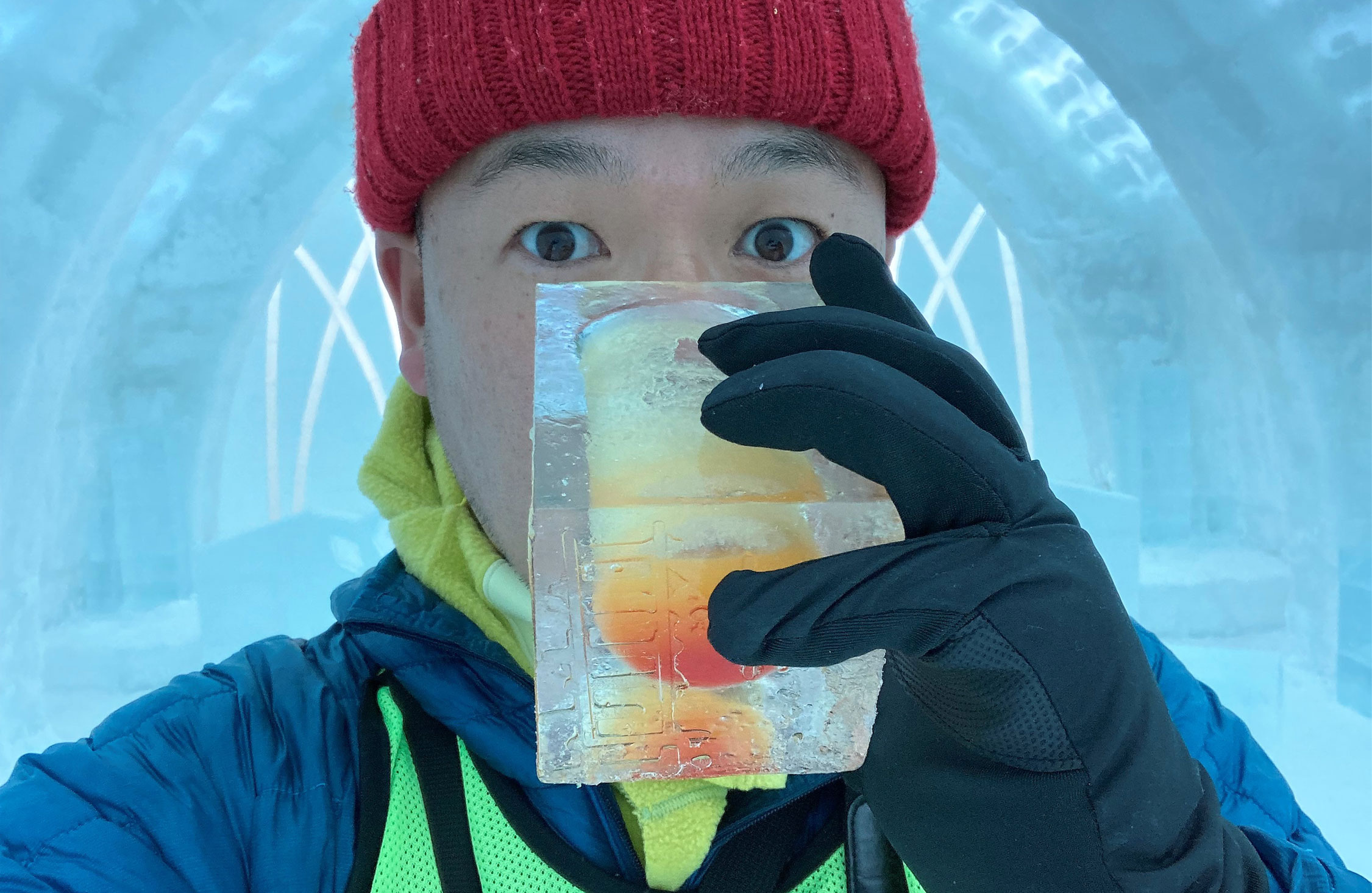 グラスに口をつけると、唇がヒンヤリ。でもお酒が身体に流れ込んで、内部はホカホカ。不思議な感覚だ。グラスがどんどん溶けていくのも、面白い。