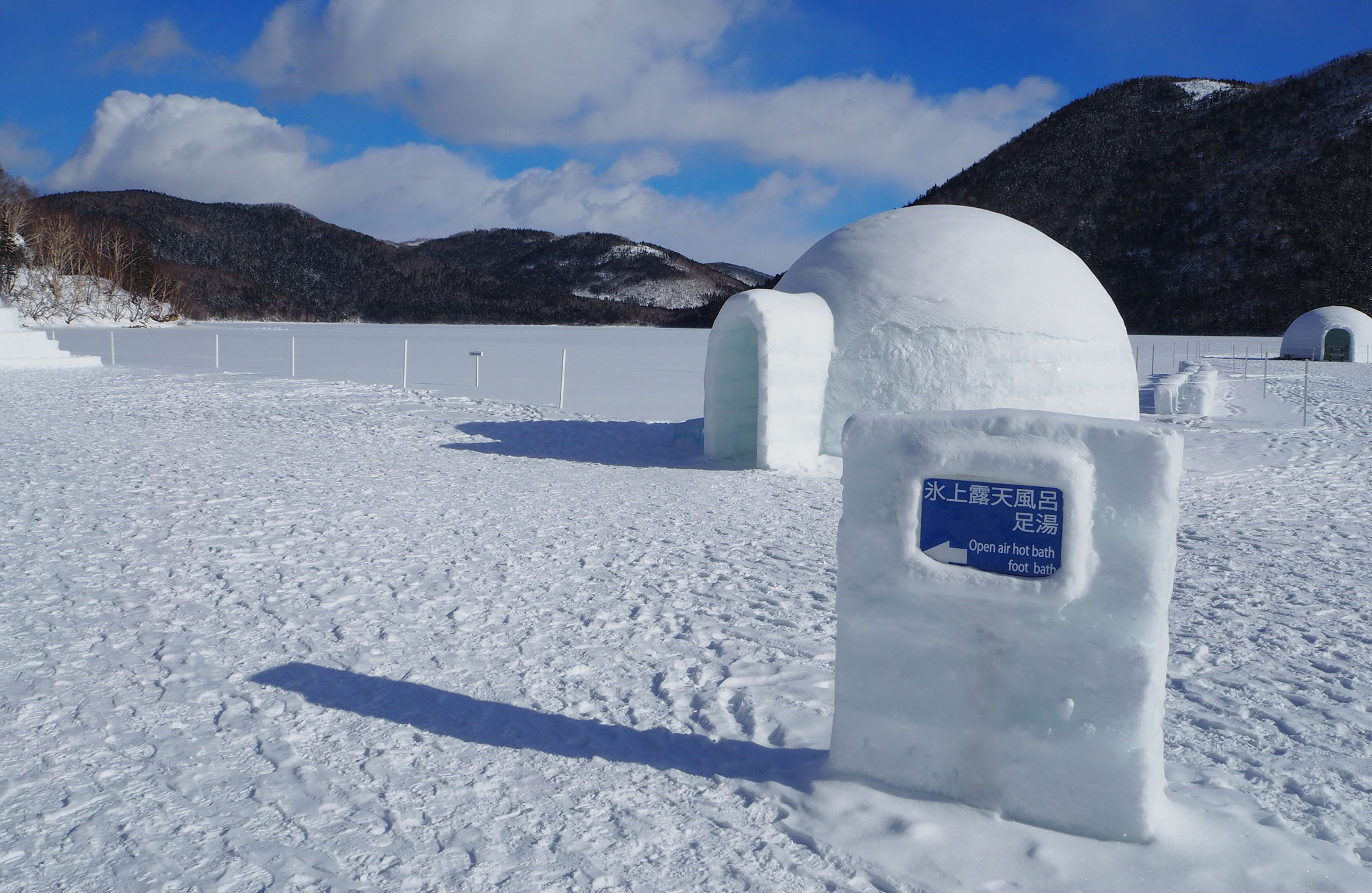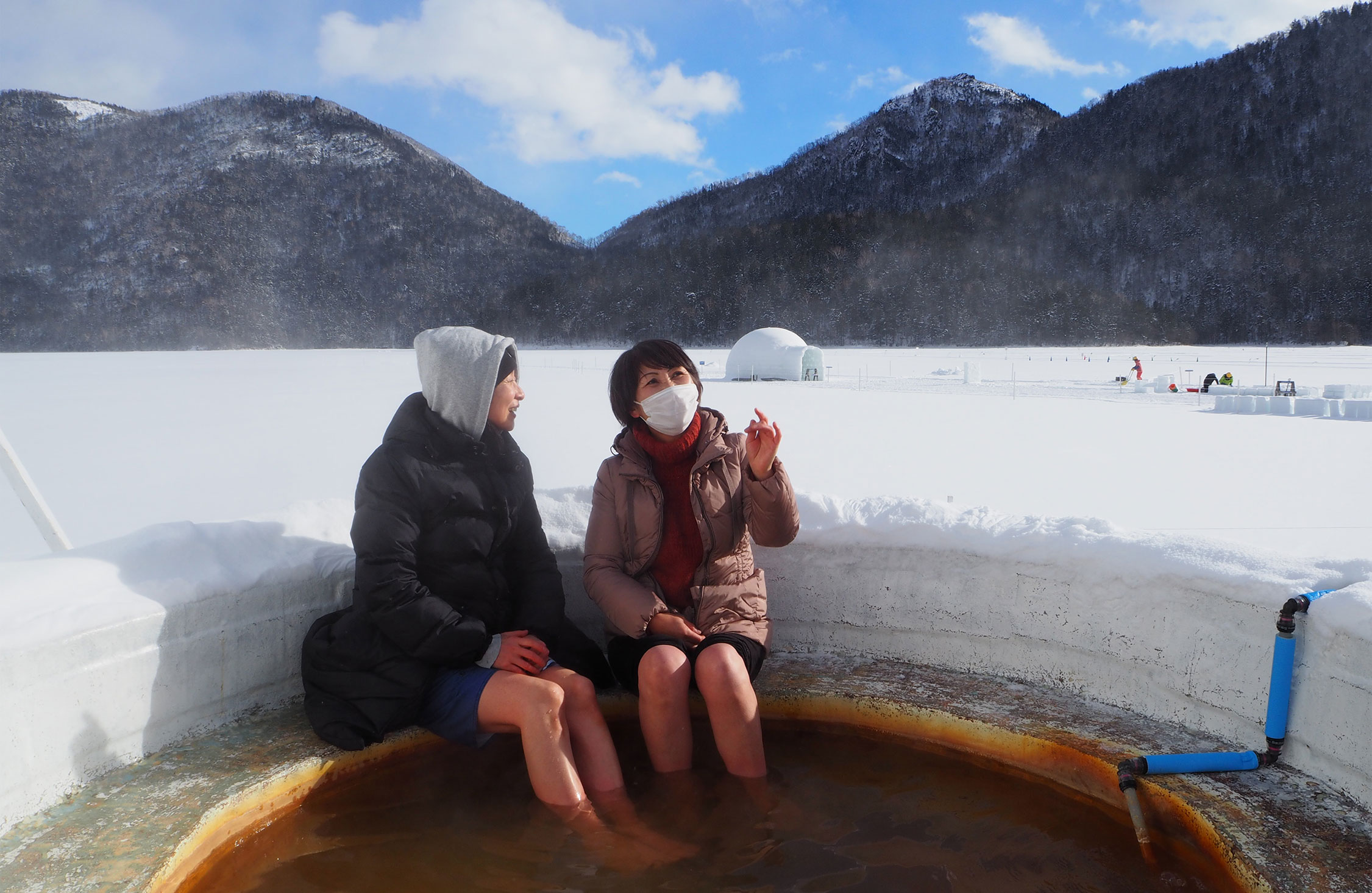 次に向かったのは日本で唯一、凍結した湖上に設置された氷上露天風呂! ここの大きな特徴をひとつ挙げよう。それは、湯船ひとつの混浴ということ。しかも、水着の着用は義務付けられていない。どういう選択をするのかは、あなた次第。いやいや、さすがにみんな水着でしょう、という考えで入ったら、水着を着てない人がいた! ということもあり得るので、心の準備だけは忘れずに。