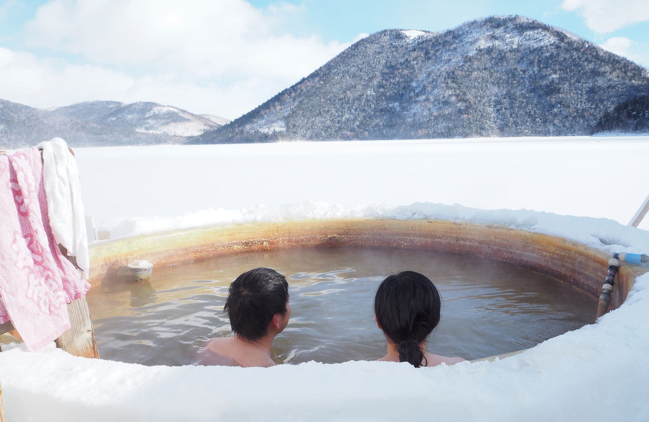 外がそれだけ冷え込んでいると、温泉もぬるいんじゃないか? と懸念する人もいるでしょう。それが、なんともいい湯加減なんです! 湖畔のホテルからパイプを通してアツアツの源泉を常に注いでいるから、外気で冷やされても42~45度前後に保たれているのだ。