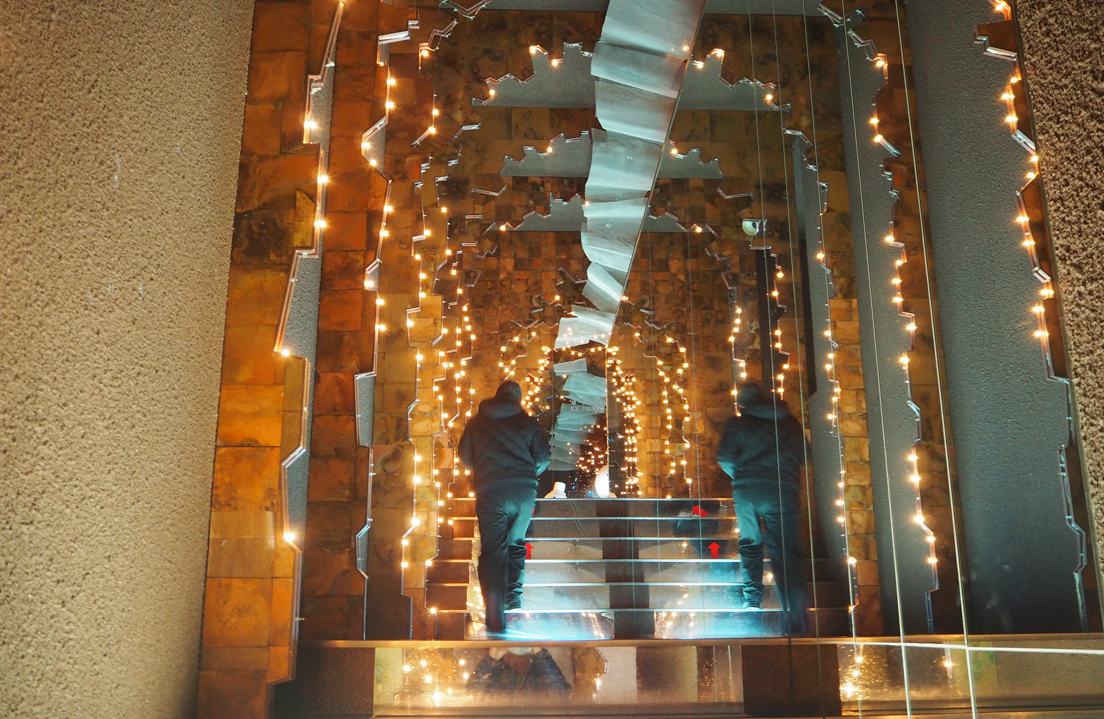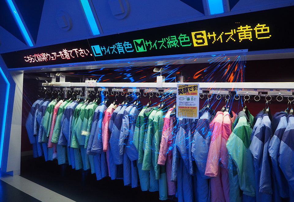 外観からは、どういう施設かよくわからない。電飾でキラキラした通りを進んでいくと、たくさんの防寒着が用意されていた。薄着の人、寒さに弱い人にはここで防寒着を貸してくれる。僕は冬場にたくわえたミートテックがカラダを守ってくれるので、手袋だけ借り、あとは都内で冬のシーズンにしている服装、ダウンジャケット、トレーナー、防寒下着、下半身は温かい素材のズボン、防寒下着のままで足を踏み入れた。