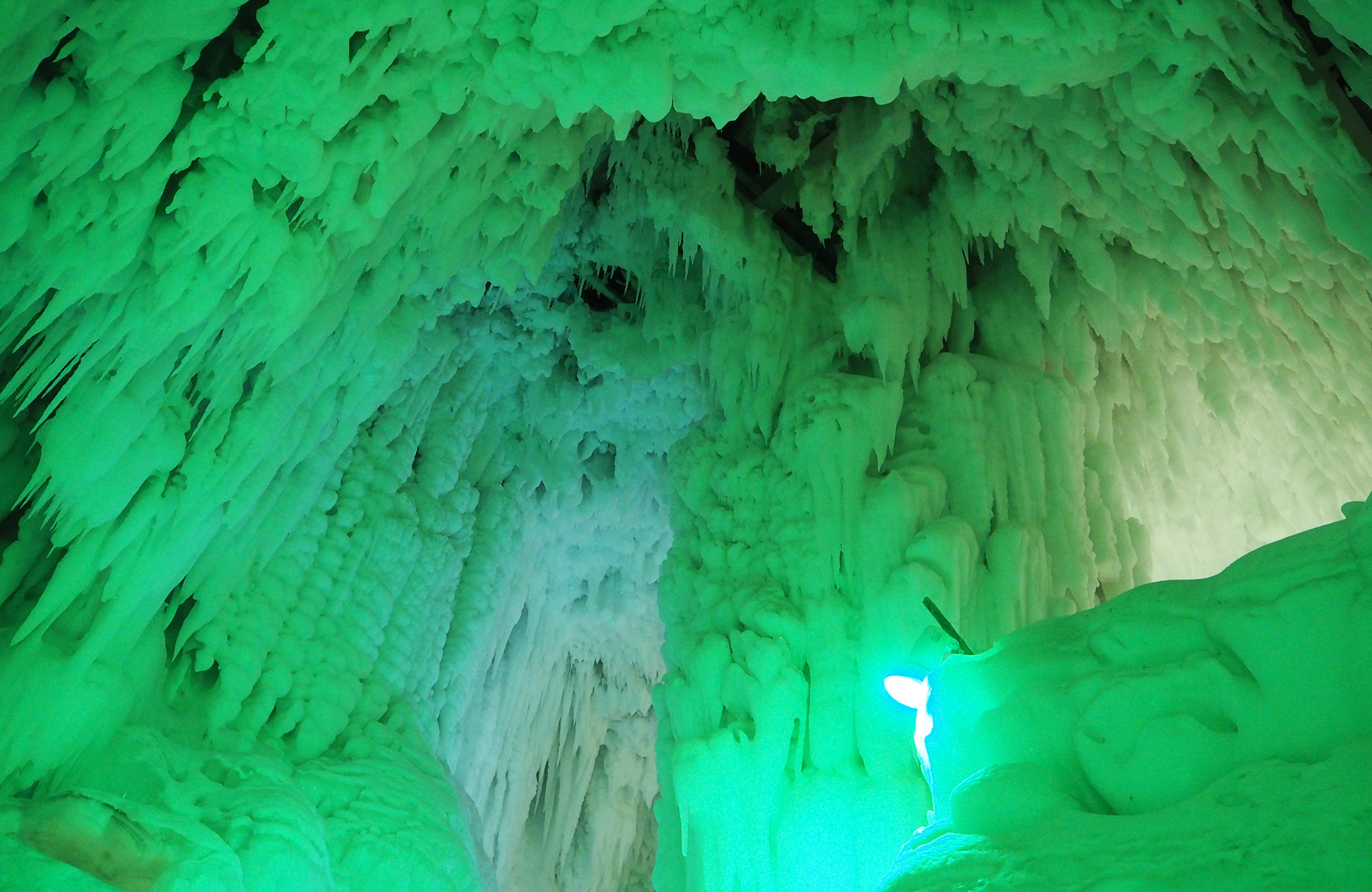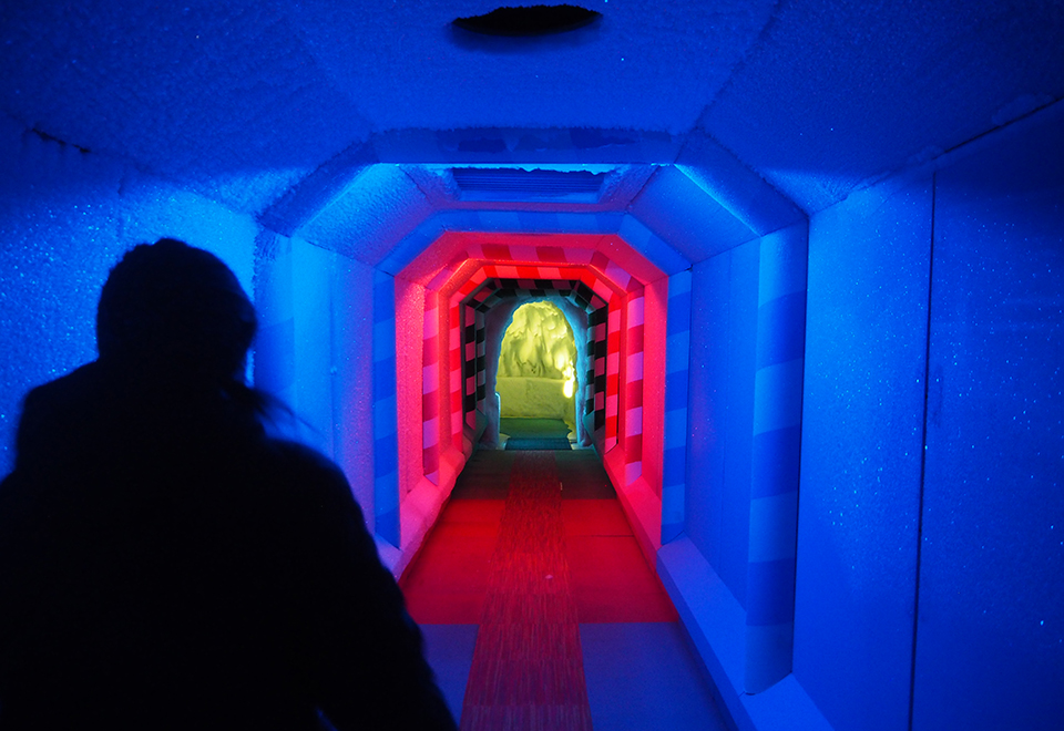だんだん冷たい空気が立ち込めてくる。そうして間もなくすると、「ここから先はマイナス20度」と書かれた宇宙船のような扉が! それを開けると、目の前に現れる氷の世界! ここは室内。でも、見渡す限り氷なのだ。まるで、氷の鍾乳洞である。「どうですか? 寒いですか?」とスタッフの今野亜希さんが素敵な笑顔で僕に尋ねた。