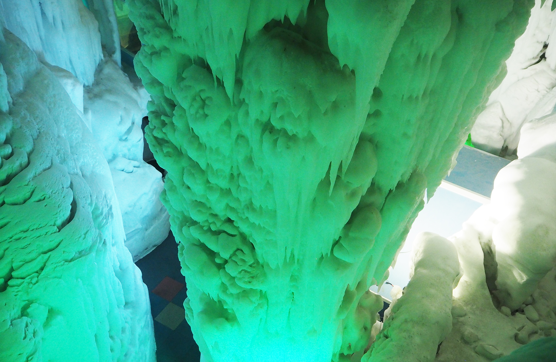 館内の開けたスペース、アイスホールには大きな氷の山がそびえ立ち、周囲の壁も全面的に凍っている。凍っていないのは床だけだ。どうやってこれを作ったのだろう?