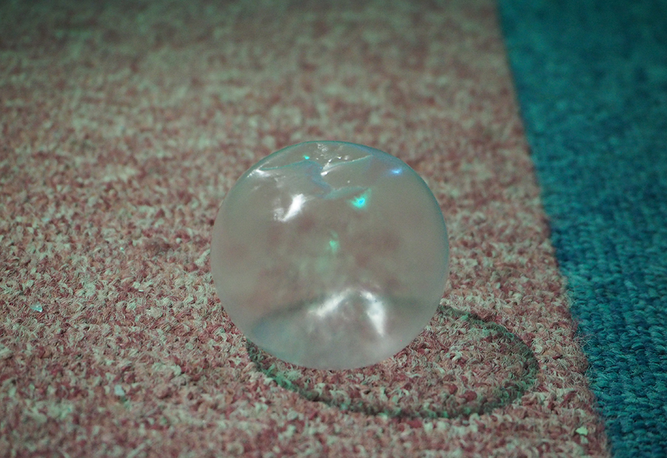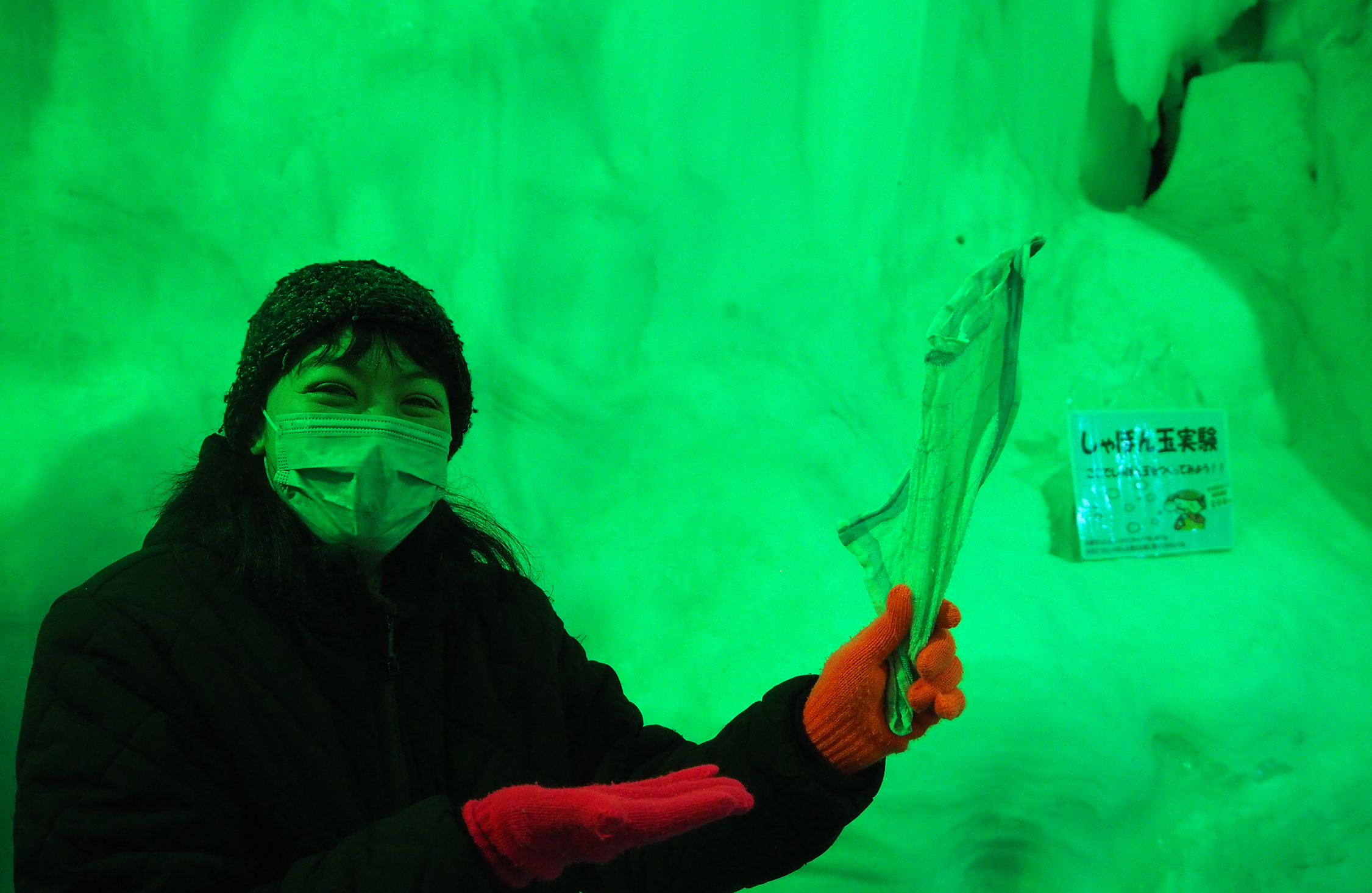 今野さんが次に取り出したのは、シャボン玉。「吹いてみてください」と手渡されたので、ふーっと息を吹きかけると、シャボン玉がたくさんできた。なんと! それが足元に落ちても割れずに、コロコロと転がっている! 「マイナス20度の世界では、シャボン玉ができた瞬間に凍り始めるんですよ」。凍り付いたシャボン玉は、触るとすぐに破けてしまうんだけど、それにしてもシャボン玉の形を写真に収めたり、手のひらに乗せたりするのは不思議な感覚だ。
