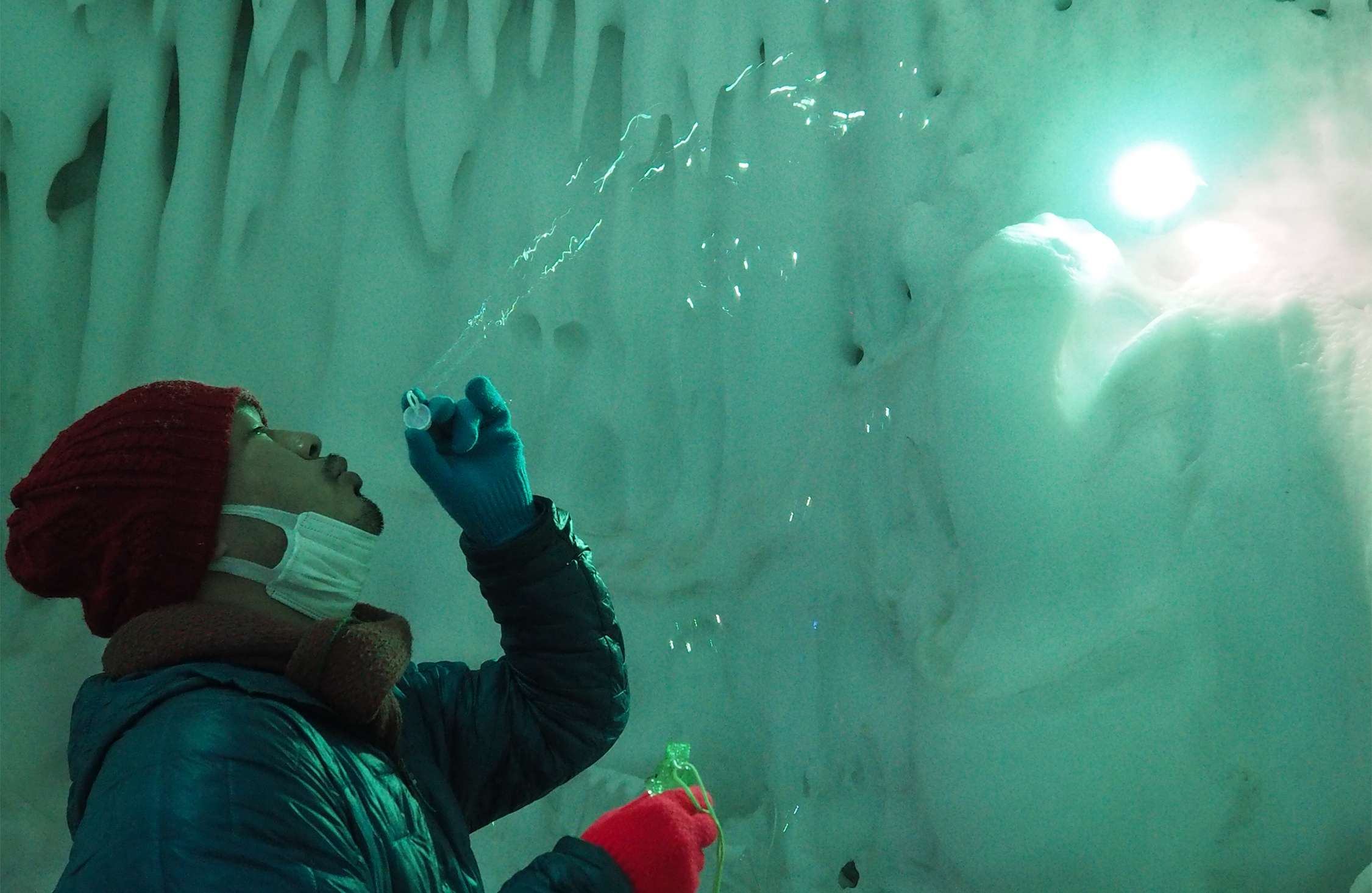 「開館以来、30年以上、毎日水をかけています。それが新しい氷になって、どんどん大きくなっているんですよ。この施設の氷の重さは、ぜんぶで1000トンあると言われています」