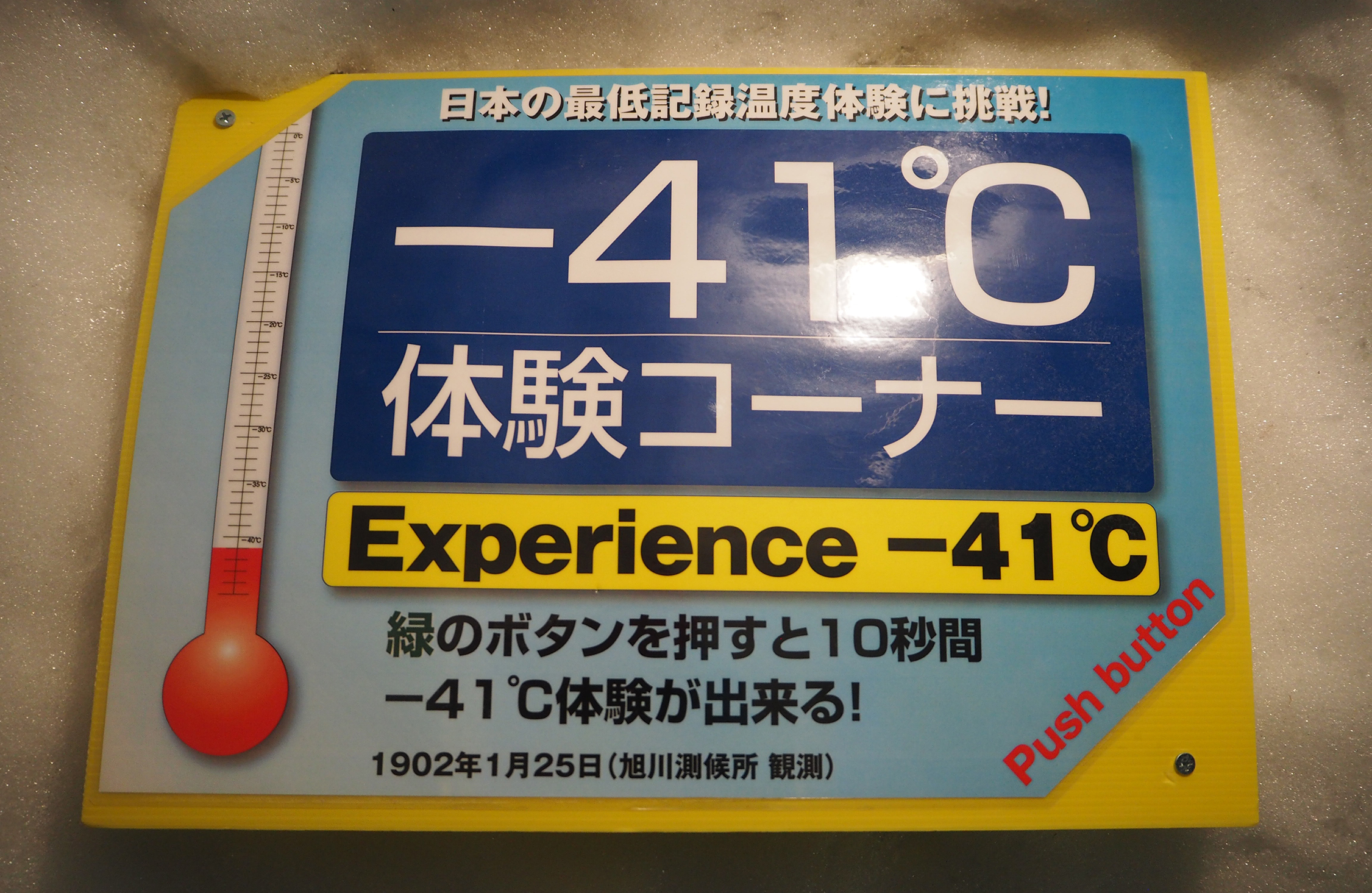 興奮して寒さを忘れ始めた僕が次に向かったのが、本日のメインイベント、「マイナス41度体験」。赤や青にライトアップされた怪しげな部屋に入るとボタンがある。それを押すと、風速20メートルを超える強風が頭の上から吹き付けてくるという仕掛けだ。風速1メートルで体感気温が1度下がるので、マイナス20度プラスマイナス20度強で、マイナス41度の世界を味わえるというわけ。
