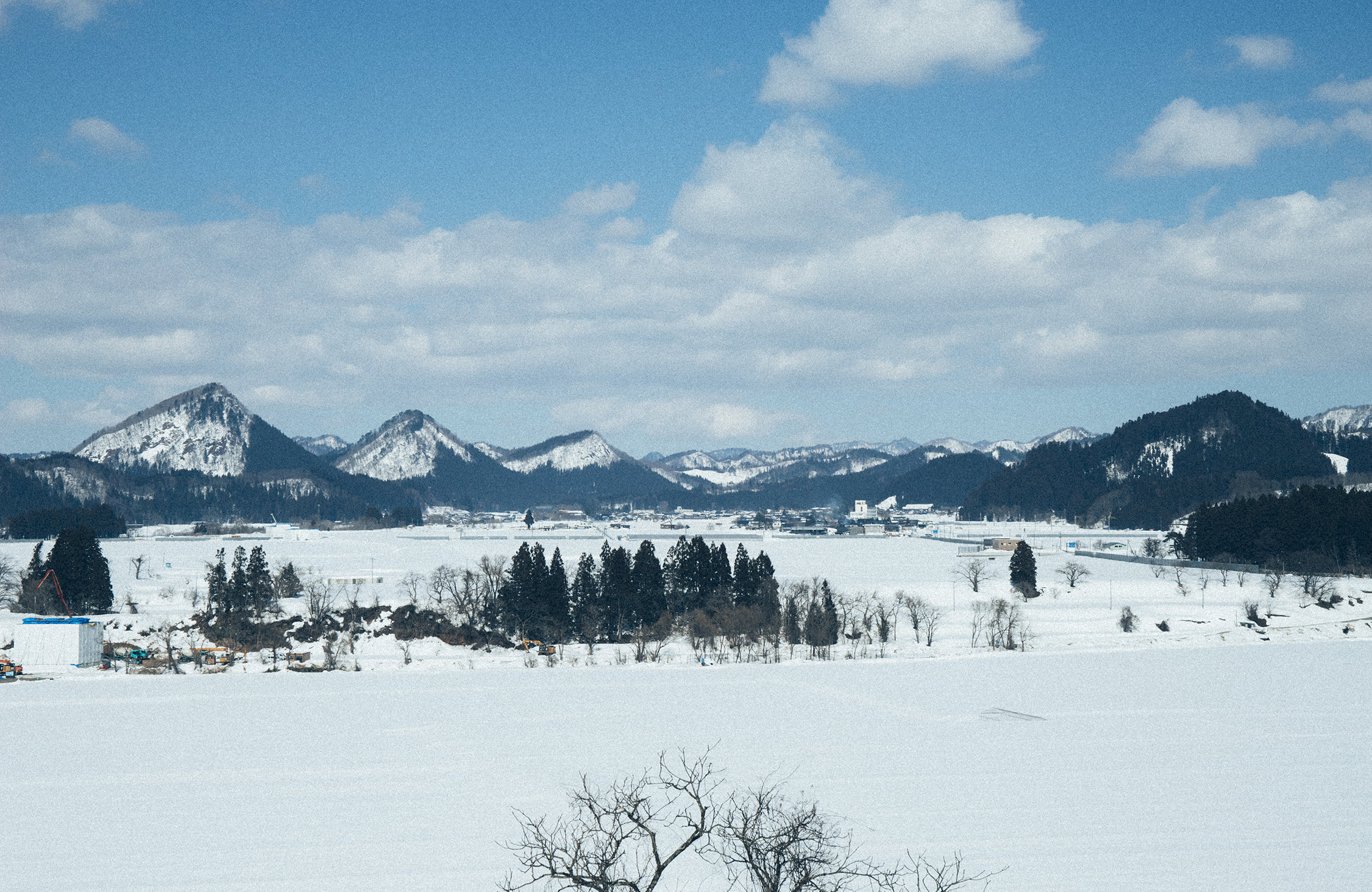 山形新幹線の終着駅がある新庄から国道13号線を北へ向かうと、田園地帯の奥に連なる、分厚い雪化粧を施した奥羽山脈が見えた。晴れ渡った青空にうねりながら突き出す、白く輝く大地のしわ。自然の生み出す造形の、息を呑むほどの神々しさ。