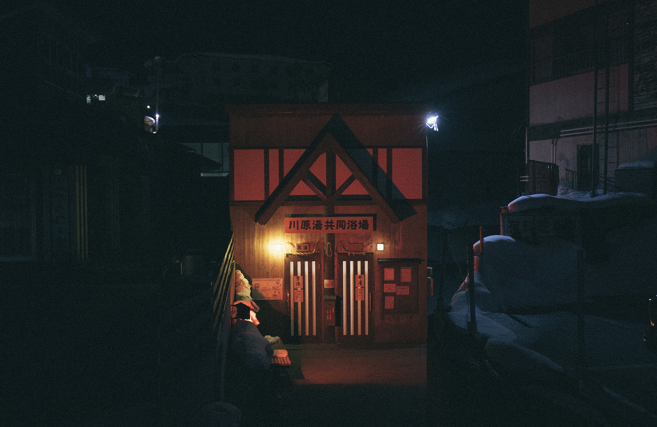 上湯と下湯のある目抜き通りから少し奥まったところに、川原湯はあった。硫化水素ガスの匂いが一段とキツくなる。木造の小さな建屋になぜか赤いスポットライトがあたり、公衆浴場と言うよりも妖しげな芝居小屋のような雰囲気を醸し出している。裏に回ると白く黄色く変色した湯だまりに、排湯が流れ出している。