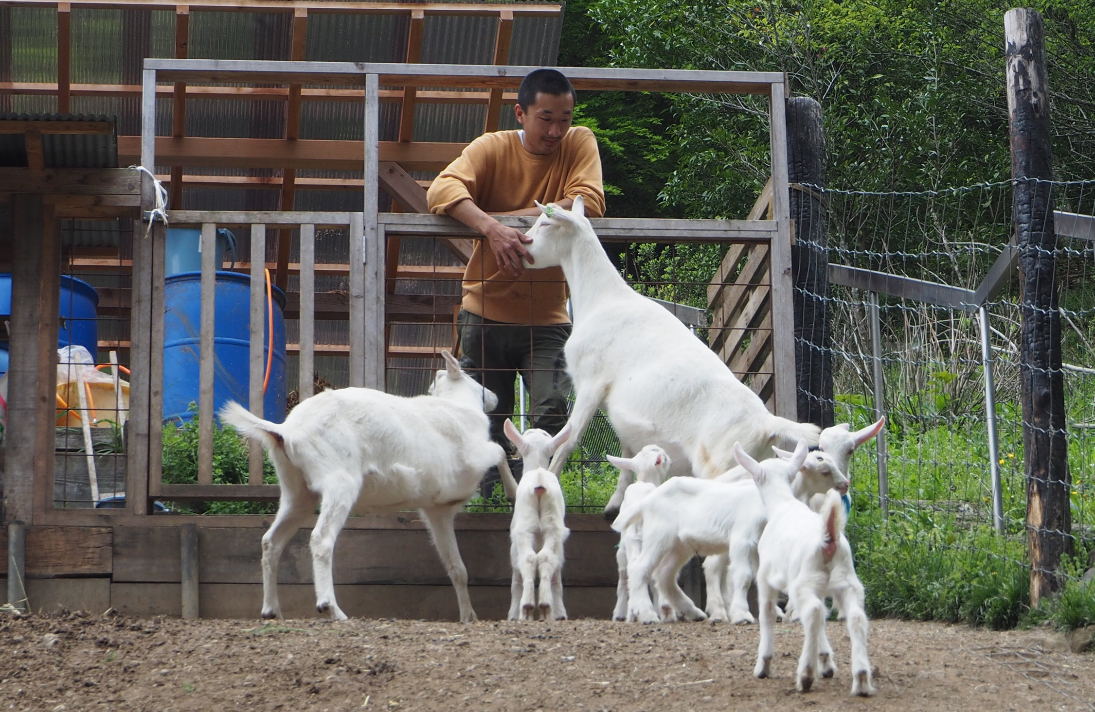 堀周(ほり・いたる)さんが山裾の急な斜面をくだっていくと、まだ生まれて数日しか経っていない赤ちゃんヤギたちが、メェメェとかわいらしい声で鳴きながら、慎重な足取りで後をついていく。斜面を登り始めると、ぴょこぴょこ跳ねるようにして、やっぱり後をついていく。堀さんがヤギ小屋の前に腰掛けると、あっという間に子ヤギたちに囲まれ、メェメェメェメェの大合唱だ。