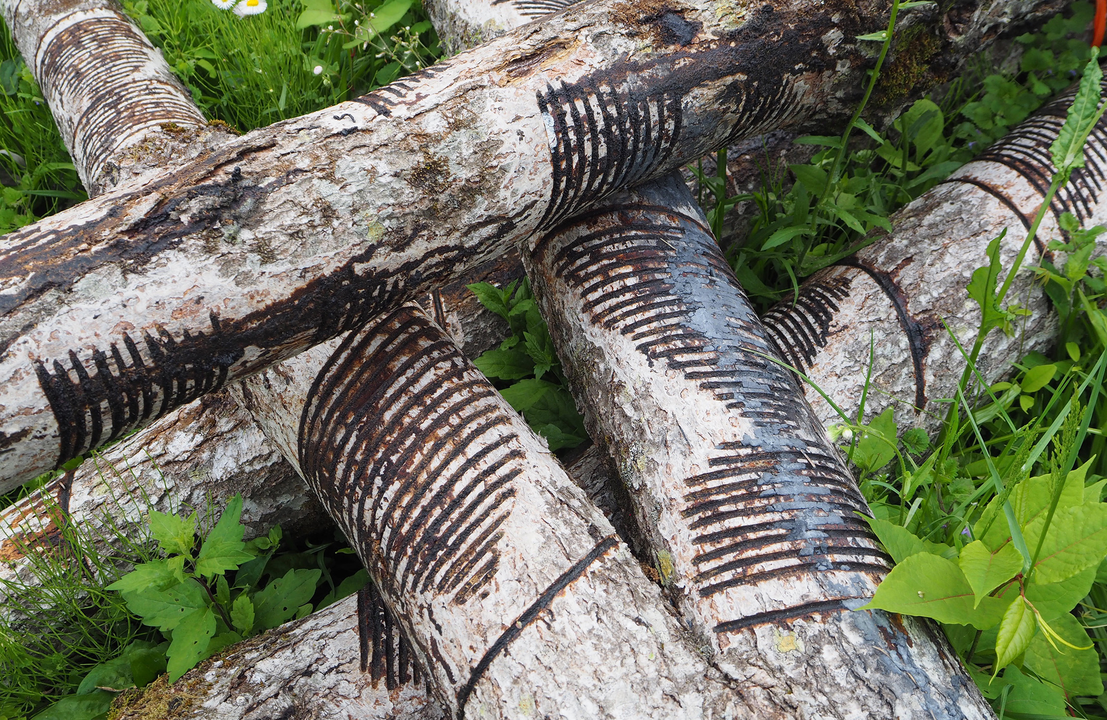 育てた漆の木から樹液を採取する作業がこれまた手間と時間がかかるらしい。私たちの目の前にはちょうど切り倒したばかりの漆の木があった。そこには、しましま模様の傷がついている。これが、漆を採取した時にできた傷なのだが、ただ傷をつければ自動的に漆液が採れる、という単純な話でもない。