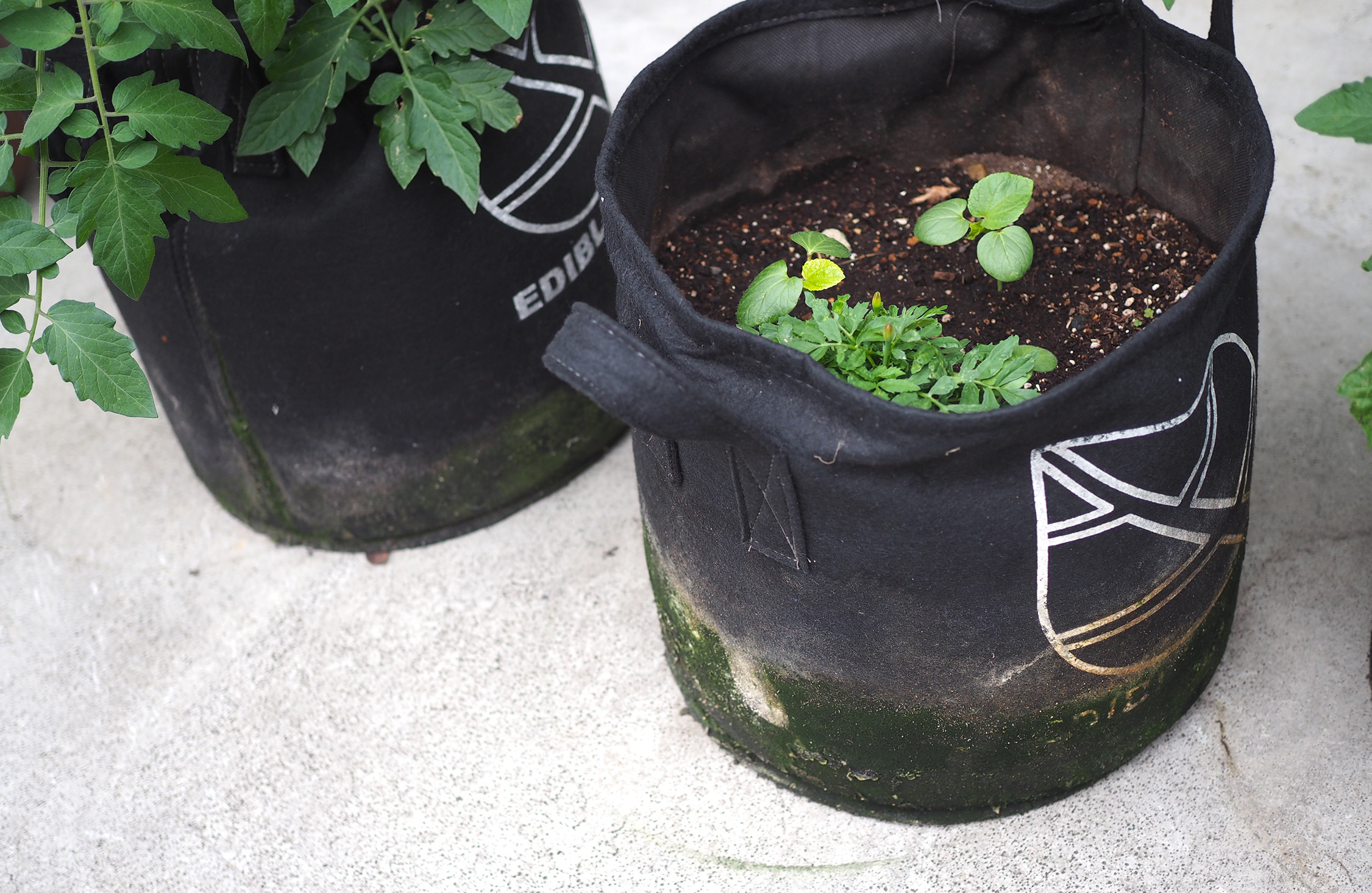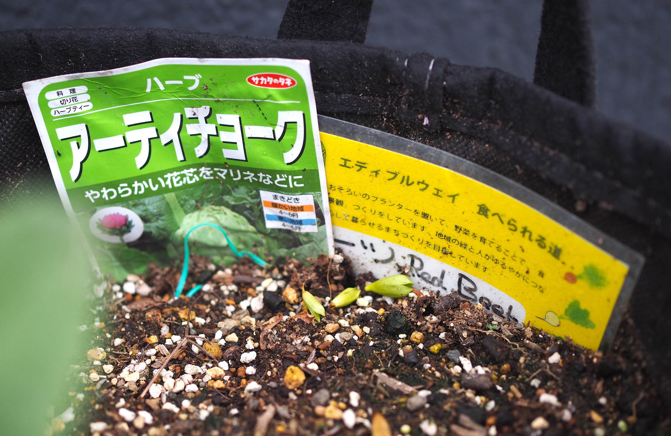 木津さんの家の前には大きな布プランターが並び、菊芋や里芋、アーティチョークなどの珍しい野菜まで育っている。なるべく変わった野菜や、子どもたちが好きそうな野菜を育てているという。ごぼうの花が咲くだけで、子どもたちにとっては大発見なのだ。