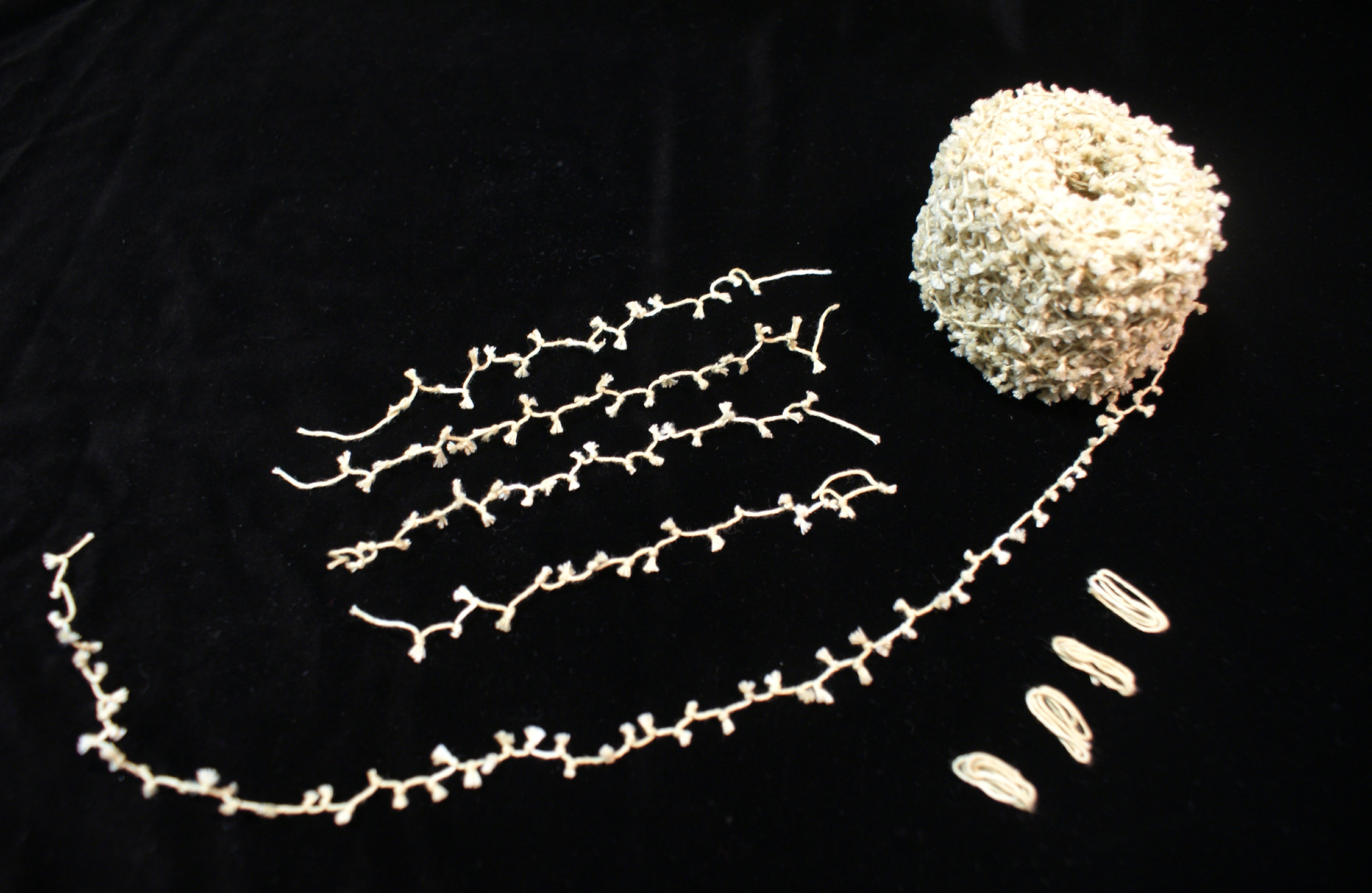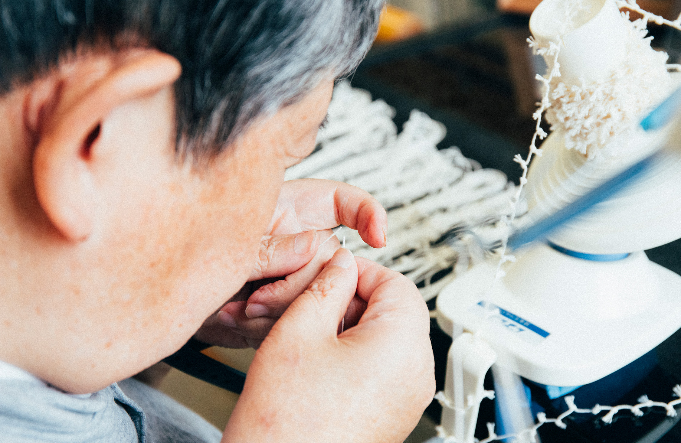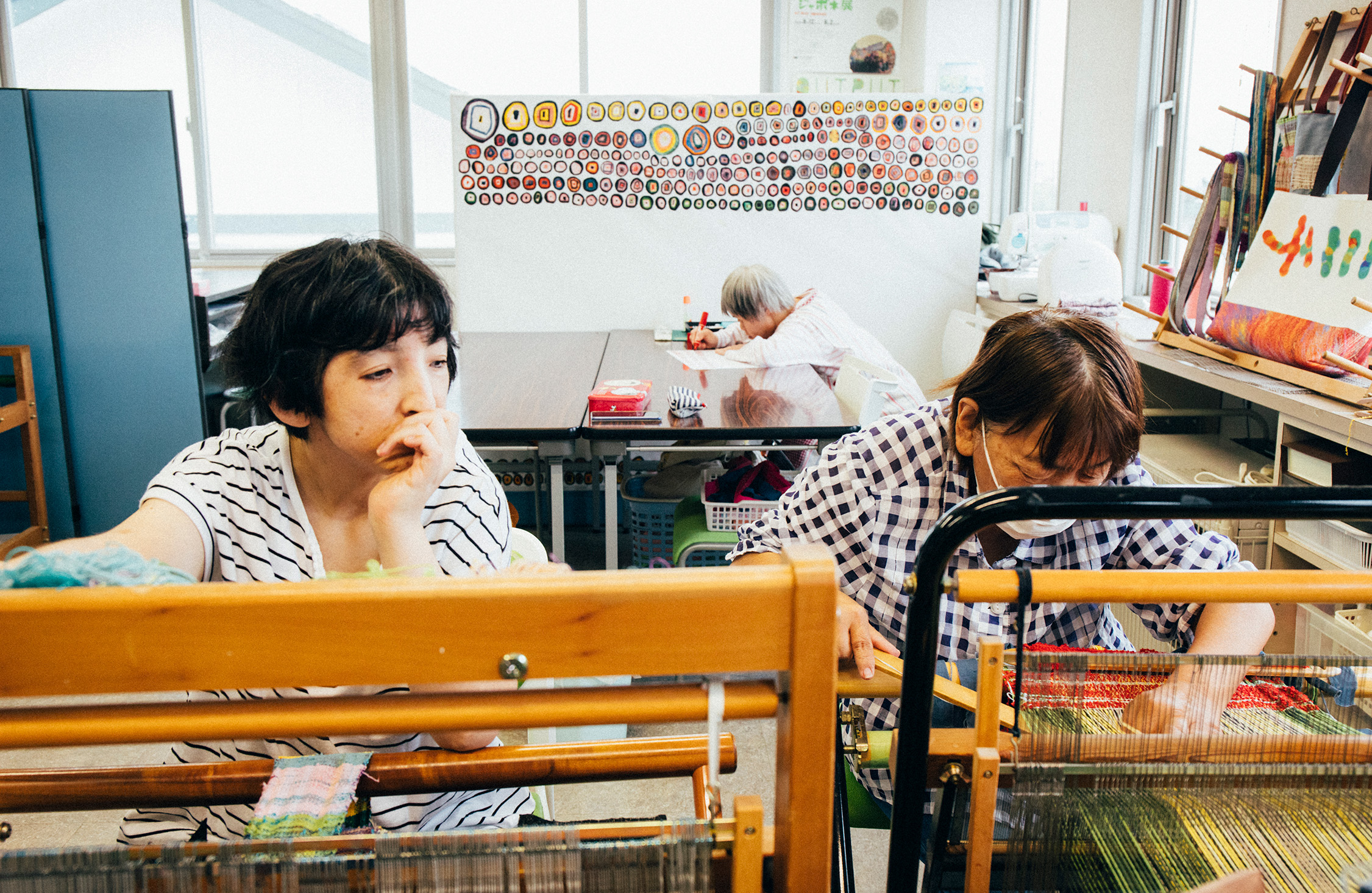 背中を丸め、白い糸と向き合うのは似里力(にさとちから)さんだ。彼は生成り糸をハサミで切っては結び、またチョキンと切っては結ぶことを黙々と繰り返す。その作業をかれこれ14年、飽きることなく続けているという。かつてアトリエで草木染めに取り組んでいた時期に、染めた糸から毛糸玉を作る仕事に従事していた似里さんは、ある時、糸が絡まった際に切って結ぶ動作に心を奪われたらしい。やがて、切れていない糸をこっそり切っては結ぶようになり、「染糸が売り物にならなくなるから止めてください」と注意されるたびに謝りはするものの、また同じことを繰り返した。やがて「もう好きにしてください」となり、以来彼の本格的な創作活動が始まった。