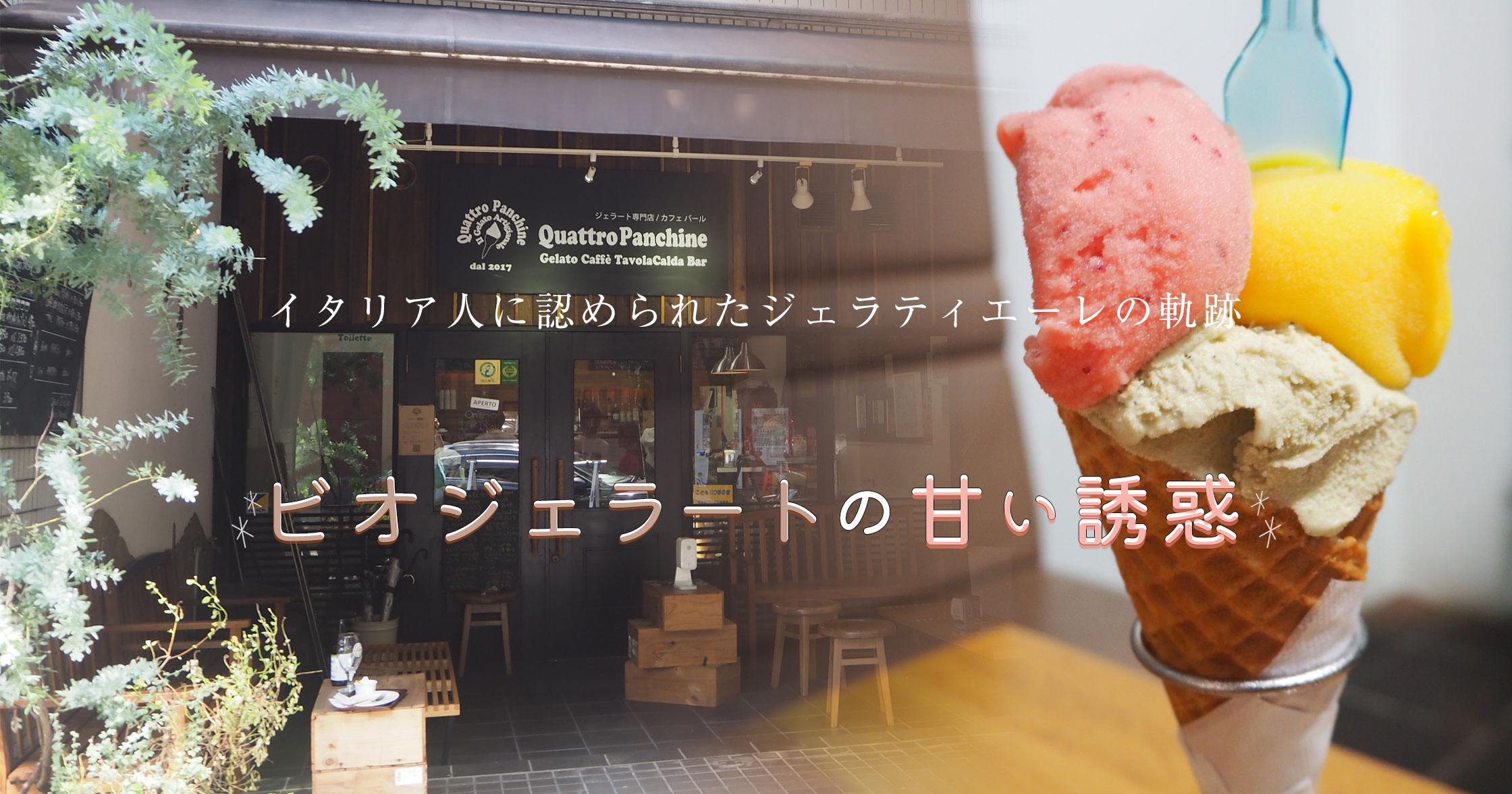 僕が8月の真夏日に訪ねたのは、「Quattro Panchine(クアットロパンキーネ)」。ここでは、一般的なジェラート屋さんで当たり前に使用されている乳化剤、安定剤の代わりに、米粉、こんにゃく、イヌリン(菊芋などの主成分のひとつである食物繊維)を使うなど、自然素材(ビオ)にこだわったジェラートを作っている。
