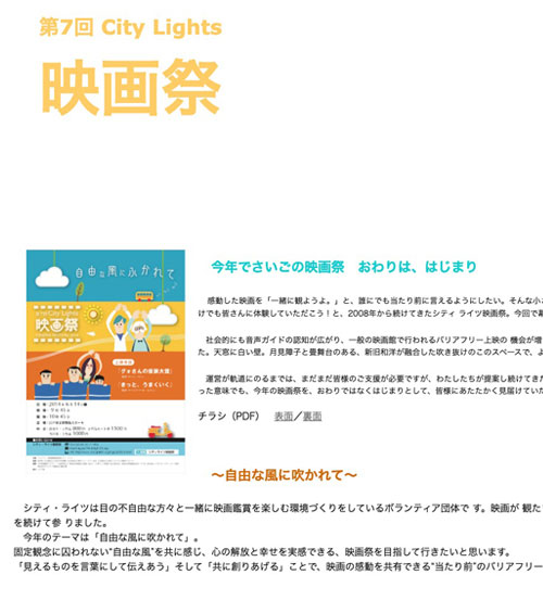 そう思いながら、2008年には「シティライツ映画祭」を開始した。それは、夢の映画館を1日だけでも体験してもらう映画祭である。上映する作品のすべてに音声ガイドがつき、映画の選定から運営までも含めて視覚障害者と共に作り上げる。