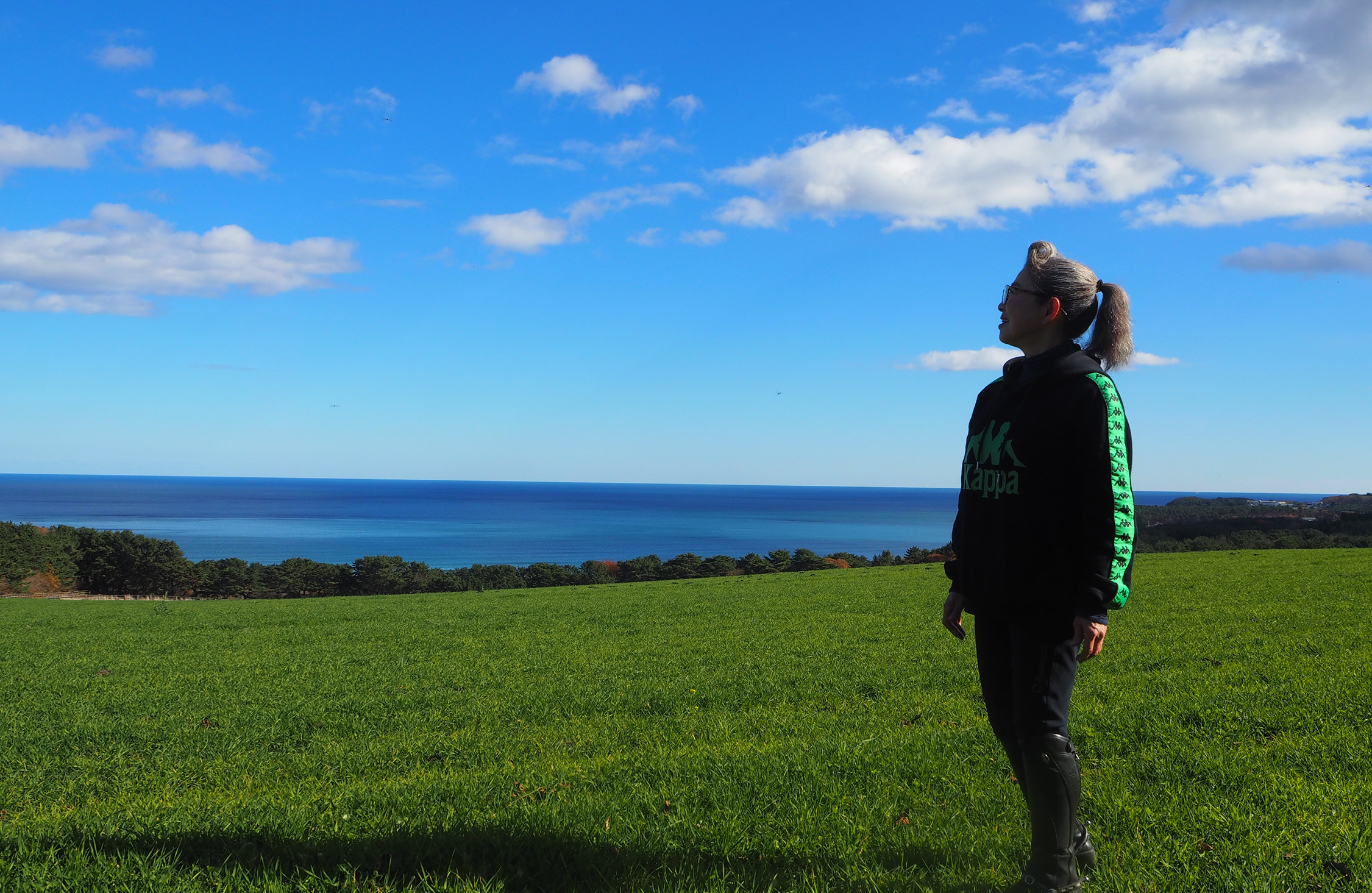 今現在、日本でアハルテケを飼育、繁殖している唯一の牧場は、とんでもなく気持ちのいい場所だった。どこからどこまでが敷地なのか一目で見渡せないほど広大な牧場は、一面グリーンの芝で覆われている。その先に広がるのは太平洋の青い海。自分が日本にいることを忘れるような風景で、ここに住む馬たちは幸せだなと思う。