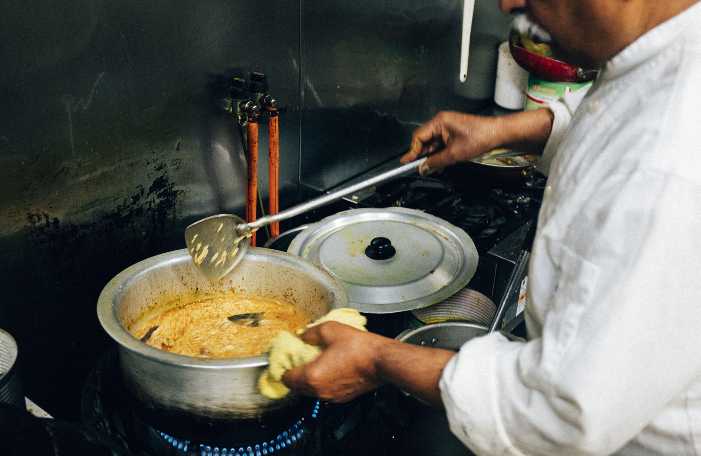 まずは、羊肉をたっぷりの塩水で1時間半くらい煮る。ホロホロになったころにフライパンでにんにくと生姜とスパイスを炒め、香りが出たら羊肉も入れて炒める。さらにフライパンに羊肉の茹で汁を入れ、パキスタンやインドで料理に使用されるインディカ米を生のまま投入、水がすべて蒸発したのを確認してから、しばらく蒸らす。完成までに2時間近くかかるため、オーダーが入ってから作るのでは到底間に合わない。よって必然的に事前のオーダーもしくはテイクアウトのみで提供することになるのだ。