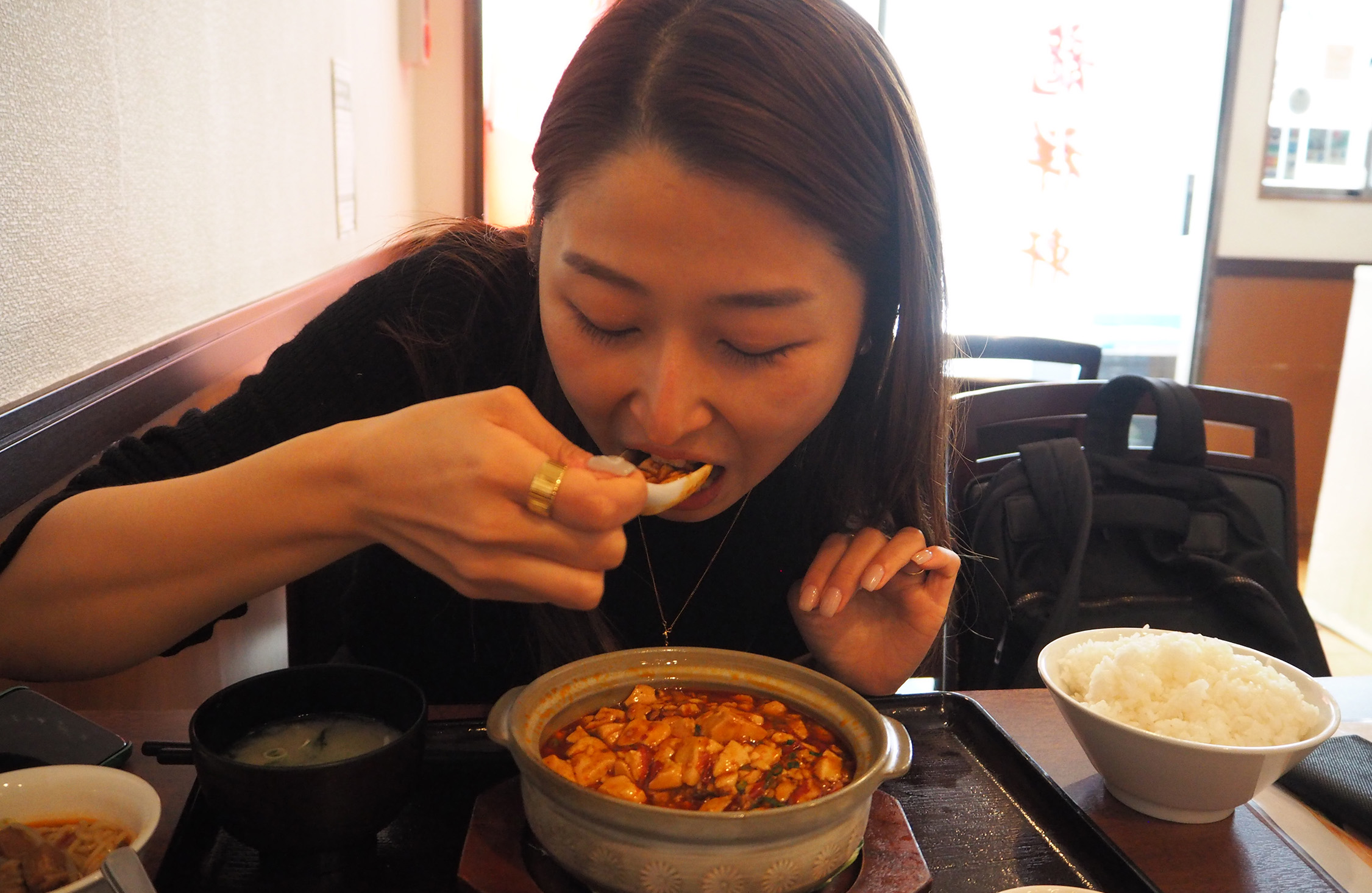 ヒナエちゃんの真の強さを知ったのは、この後だ。小皿に分けて料理をシェアしたら、麻婆豆腐のほうが明らかに辛い。辛味のサンバ隊が踊り狂いながら、無数の花火を打ち込んできたようだ。こちらもただ辛いだけじゃなく、辛うまいんだけど、一気に汗が噴き出してきて、定食についてきた白飯をかきこんだ。それでも辛さが収まらず、水をがぶ飲みする。