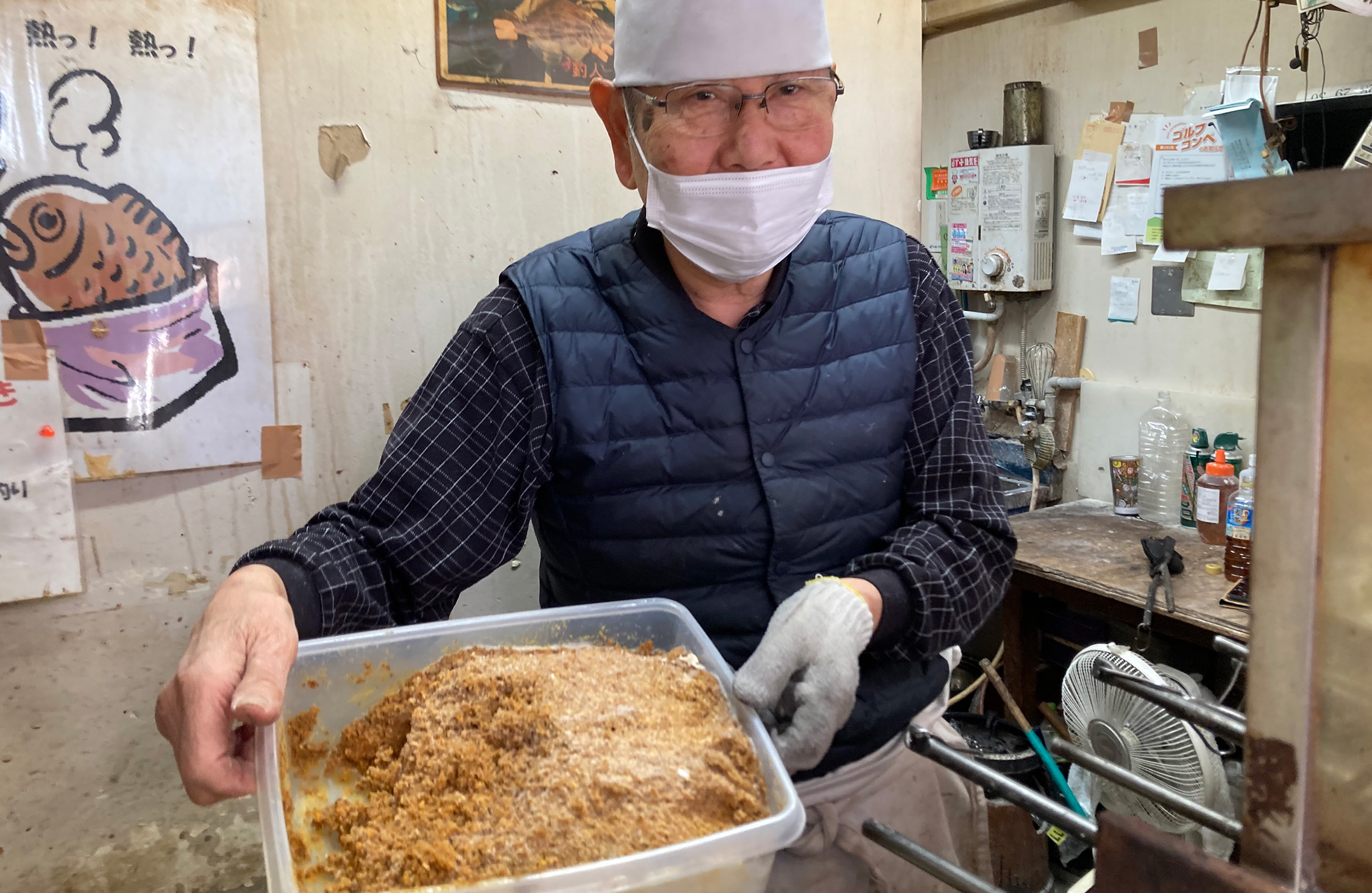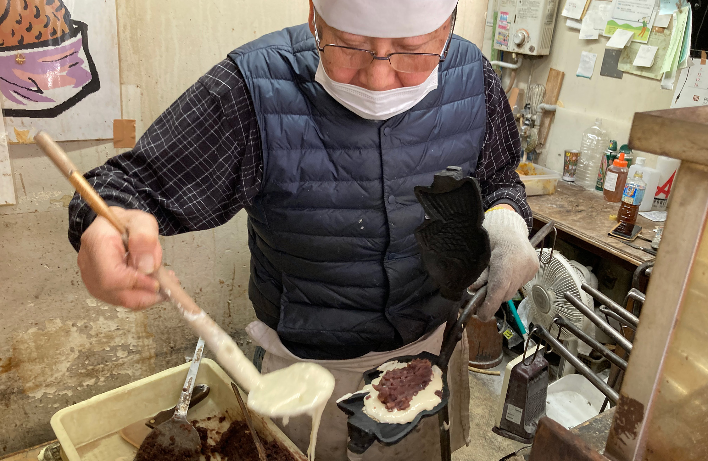 いきなりのアポなしインタビューにもかかわらずにこやかに語り始めた会長の手は、せわしなくたい焼きを焼き続けている。熟練職人の動きだ。