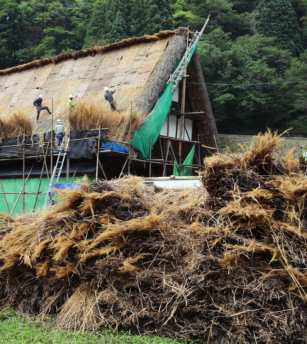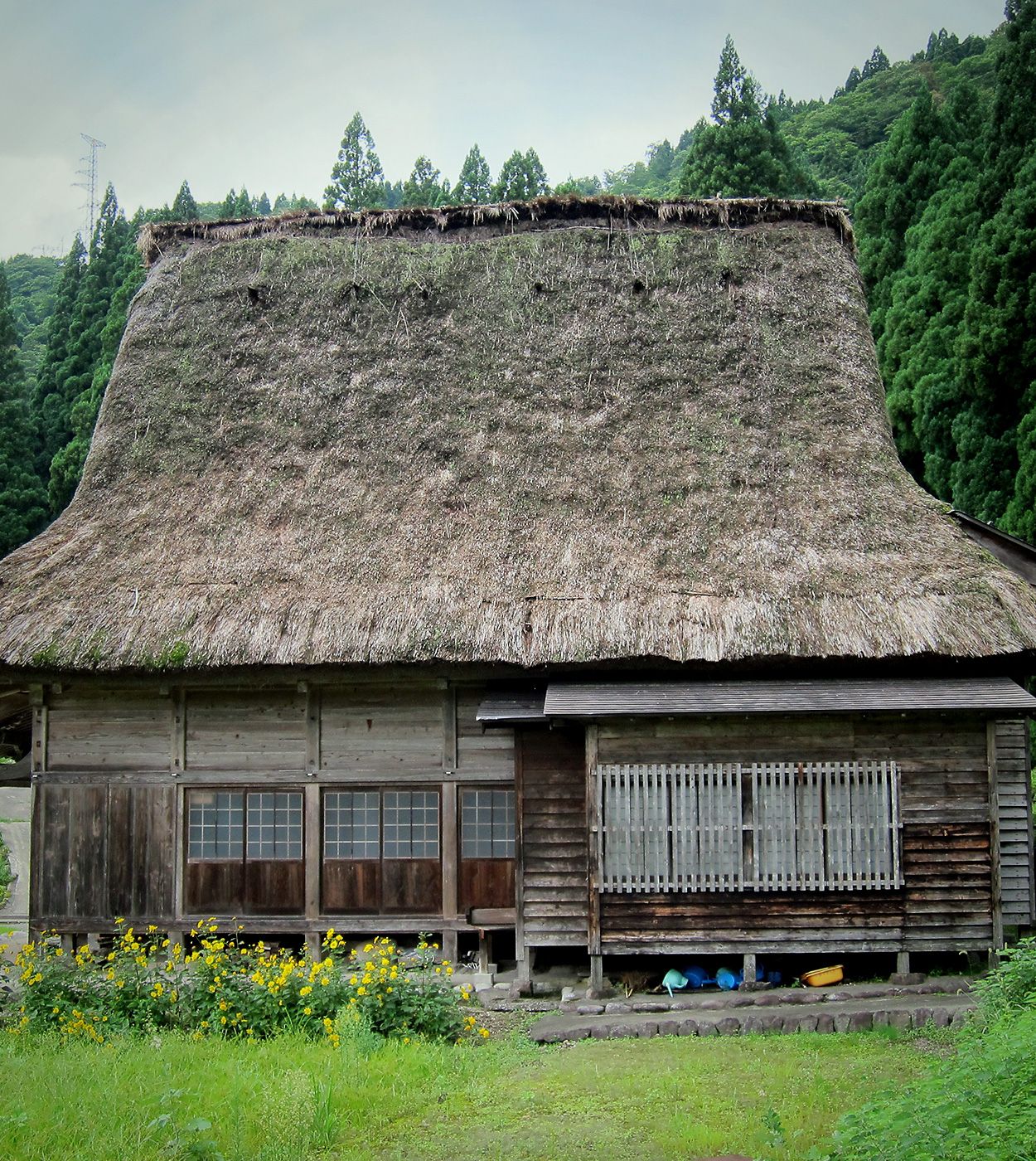 角度が急な茅葺き屋根の合掌造りの民家は、積雪が非常に多く、さらにその雪質が重いというこのあたりの自然条件に適した構造になっていて、屋根裏の大きな空間は昭和初期まで蚕の飼育場となっていた。南北に面した建物は風向きを考慮して、風の抵抗を最小限にするとともに、屋根に当たる日照量を調節して夏は涼しく、冬はしっかりと保温される仕組みになっている。