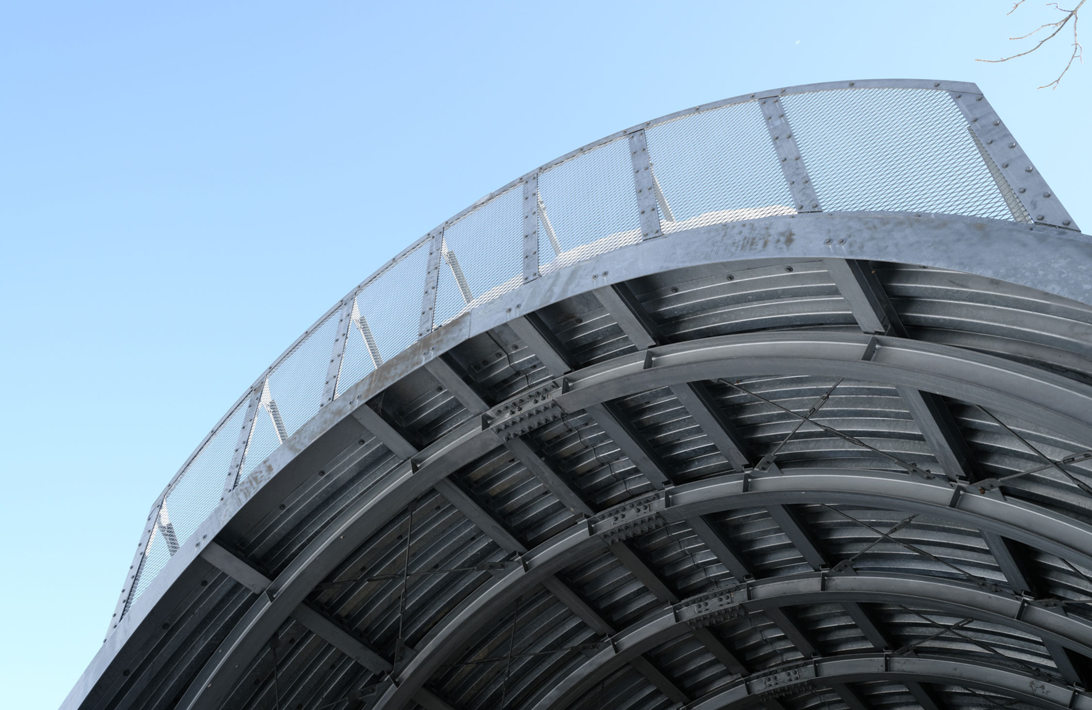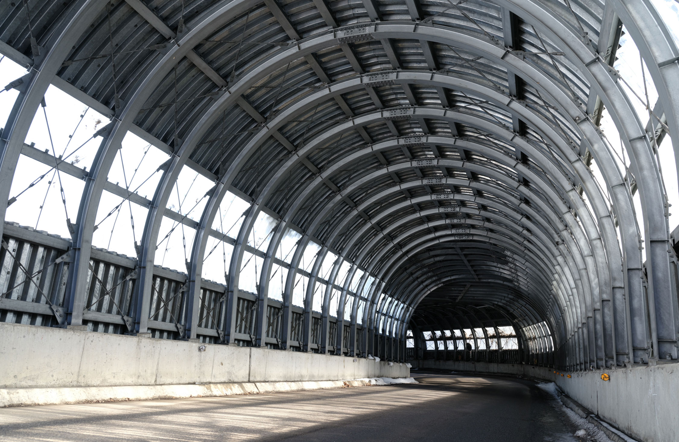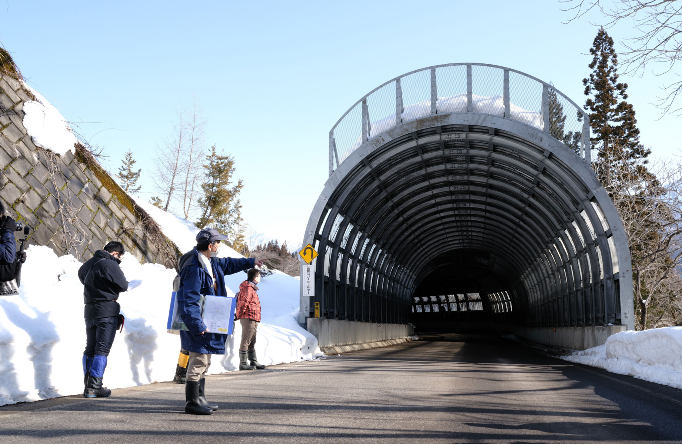 本日ふたつめの見学施設は、長野県433号線にある「沓掛(くつかけ)スノーシェルター」。前述したようにスノーシェルターは吹雪から道路やドライバーを守るものなので、トンネルなどに比べれば軽い構造になってはいるものの、積雪に耐えられる強靭な構造の半円形アーチが採用されている。