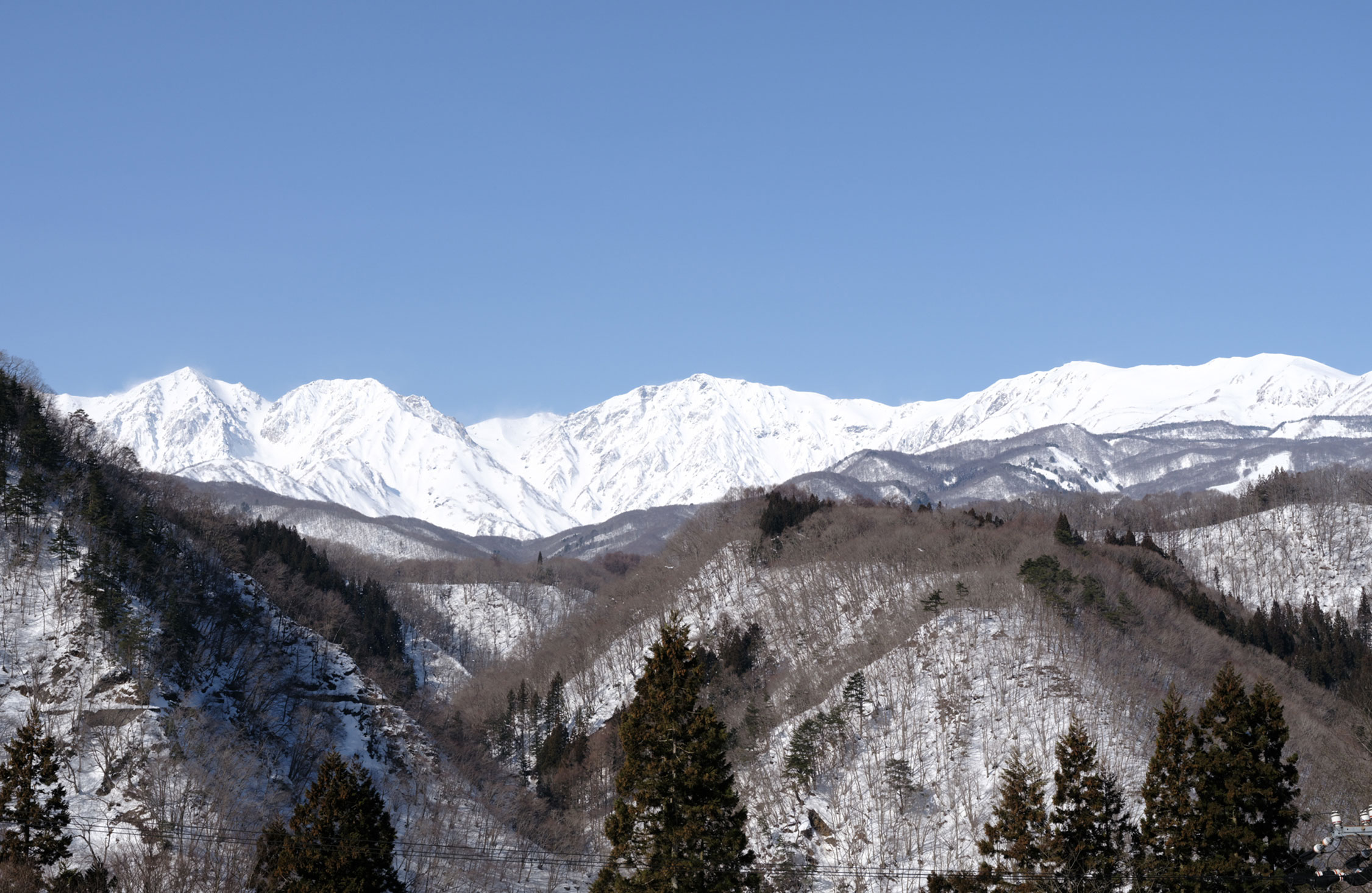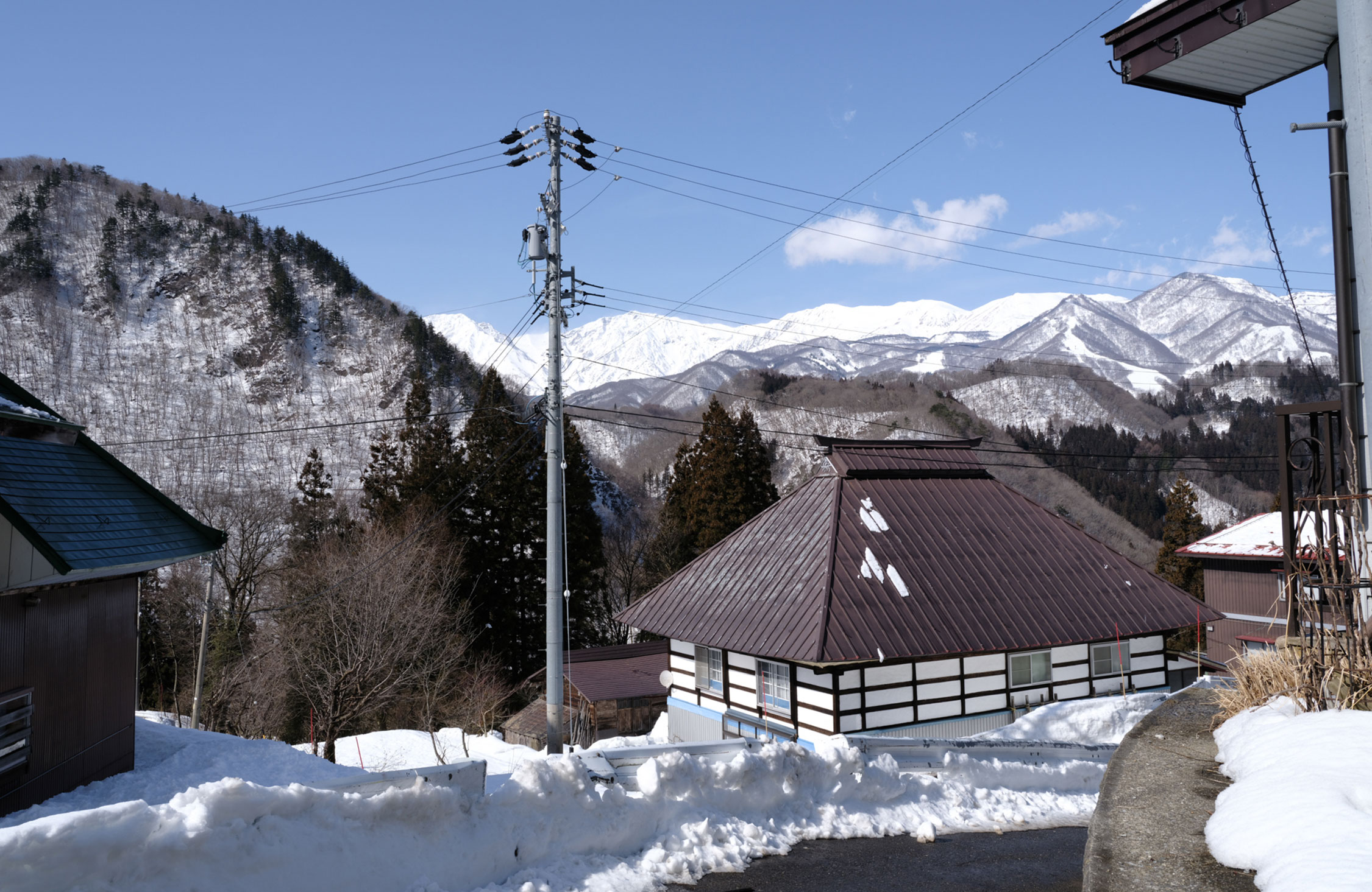 続いて向かったのは梨平集落。集落の入り口からは白馬連峰が遠くに見えた。小谷村観光連盟の職員でツアーの企画・実施を担当する伊藤嘉一さんがいわゆる「白馬三山」(白馬鑓ヶ岳、杓子岳、白馬岳)を教えてくれて、皆しばし立ち止まって、輝く山々を見つめた。