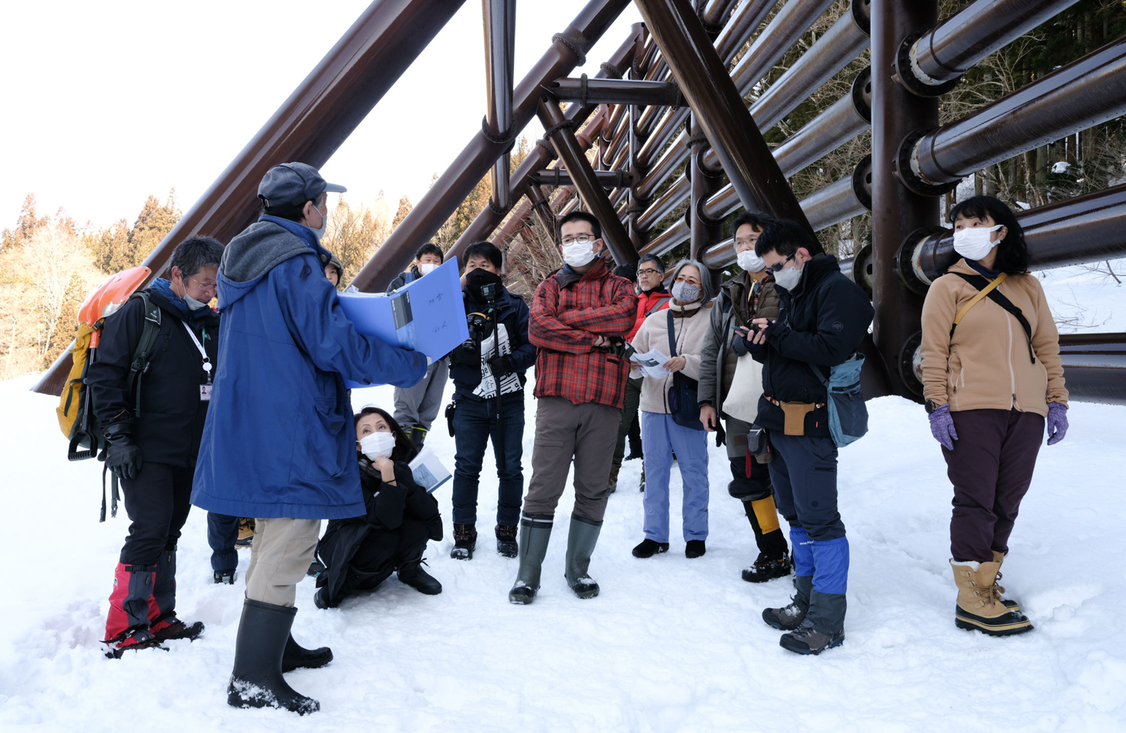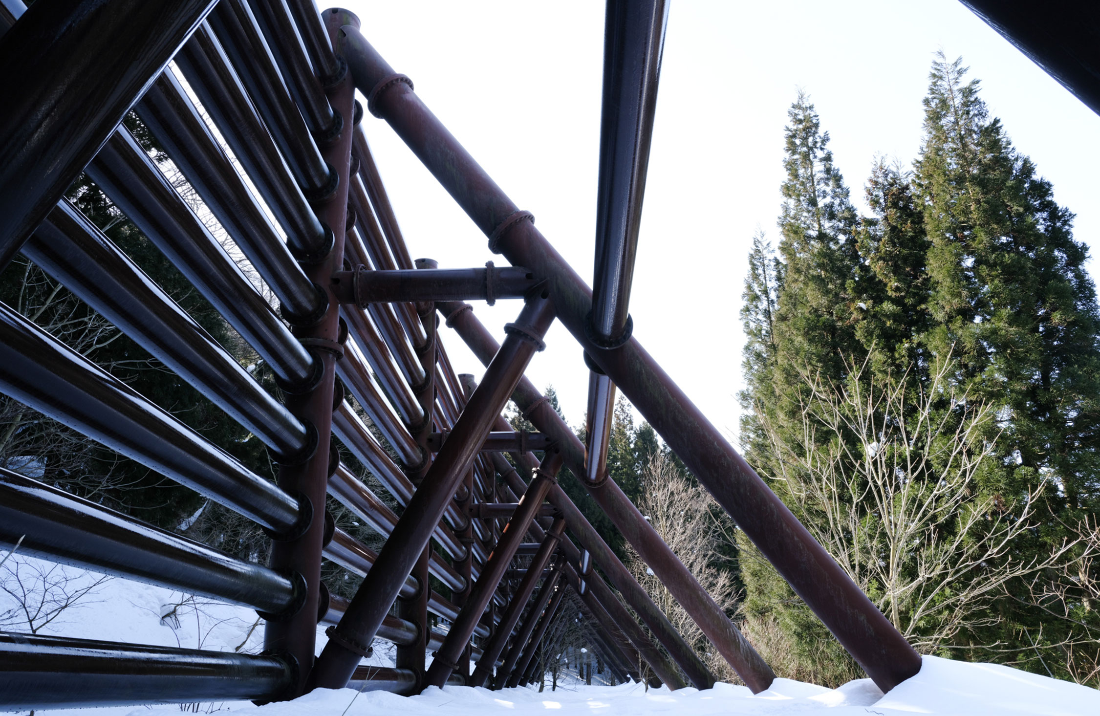 梨平集落のはずれから、雪深い坂道を上方に向かって登ること数分。山の中に不意に巨大な構造物が現れた。これが「梨平 雪崩減勢工(なだれげんせいこう)」だ。直径50センチほどの鋼管が格子型に組まれた構造物の高さは10メートルはあろうか。
