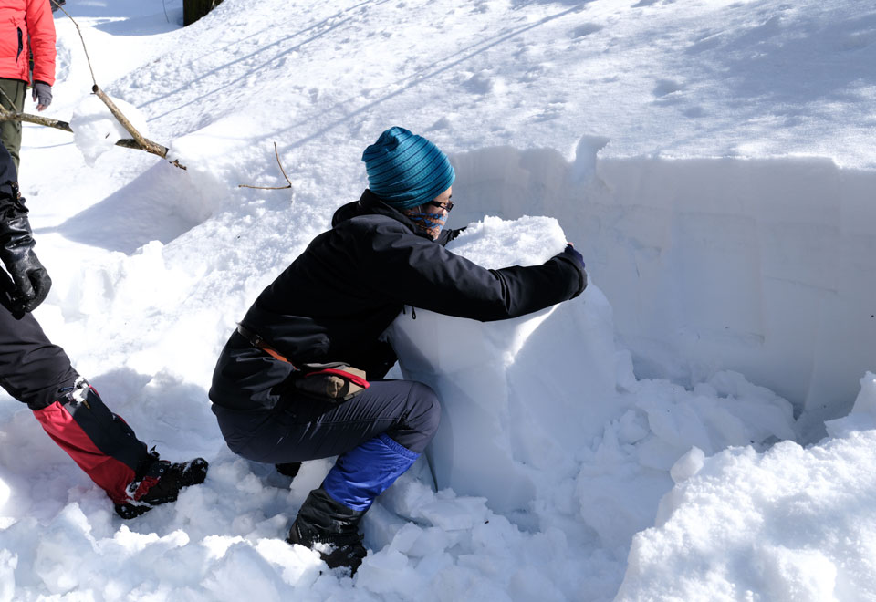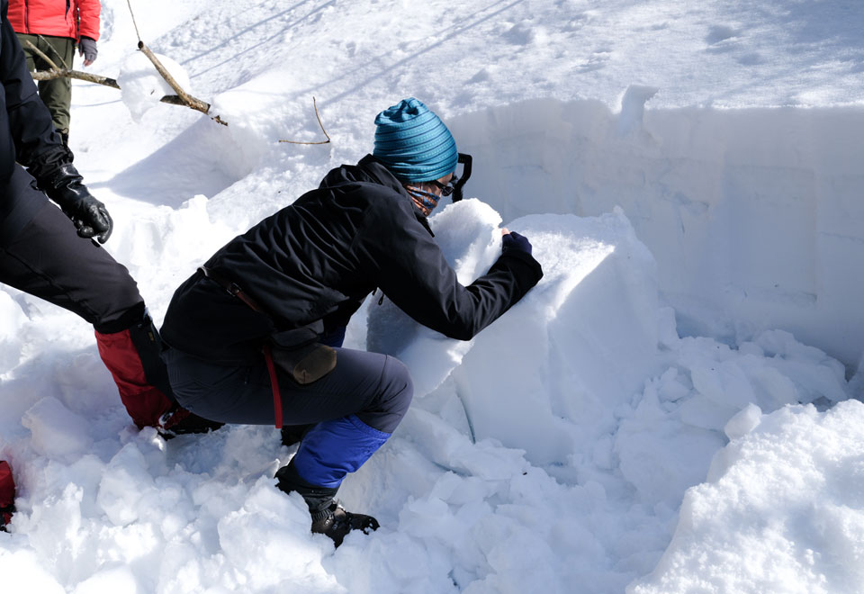 伊藤さんは持参してきていた大きなスコップを使って、まずは雪崩が起きうる斜度のある雪面を背丈ほどまでにコの字型に掘った。伊藤さんは手慣れたようすで、あっという間に、斜面に大きなコの字をつくっていく。その断面をよく観察すると、まるで樹木の年輪のように雪の層を目視することができた。