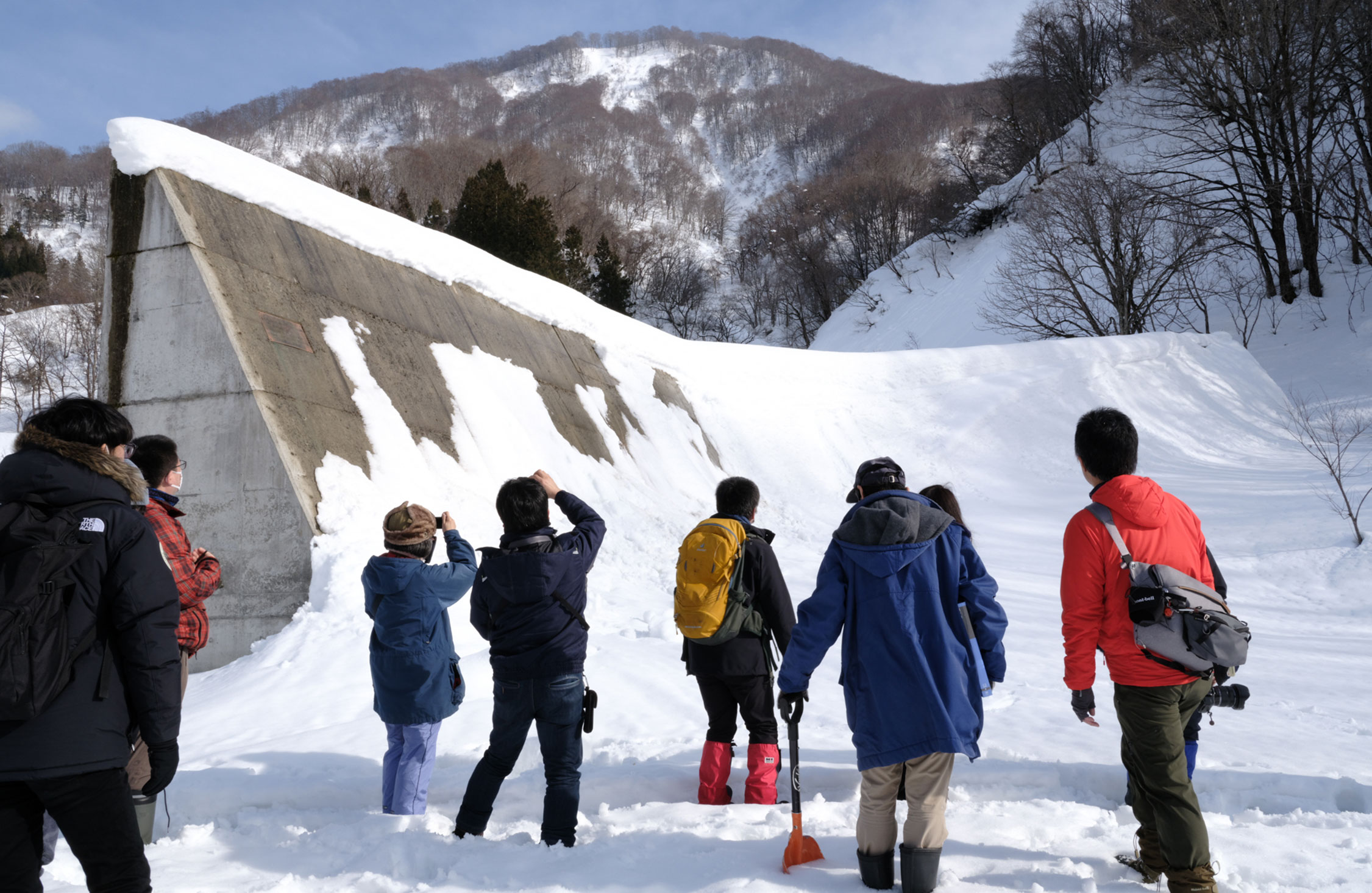 さらに雪道を登ったこの上方には、「大なで沢 雪崩誘導防護堤」がある。スノーシェッドができたことで交通障害はなくなったが、さらに確実にスノーシェッドの上に雪崩を誘導するためにできたのが、この誘導堤なのだ。