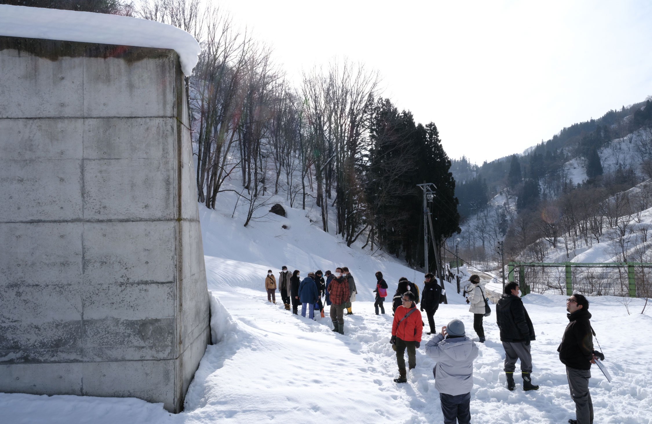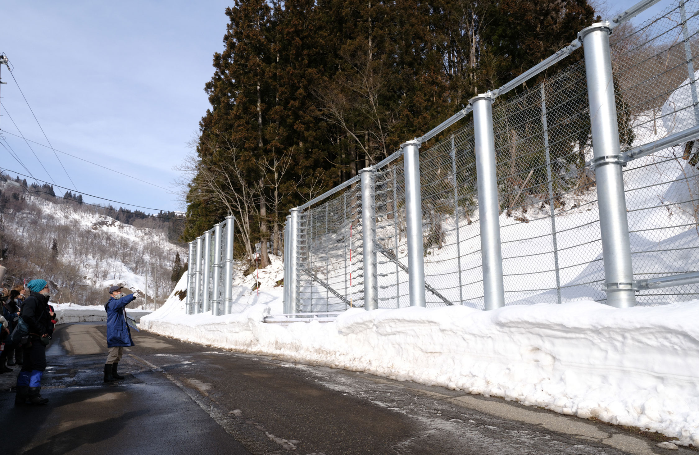 またバスに乗り、中谷・白岩地区へ移動する。このツアーは、次から次へと防雪施設だけを巡っていく。防雪施設と言っても、強固な構造物から軽量な構造物まで、さまざまな種類があることが、ここまででだいぶわかってきた。