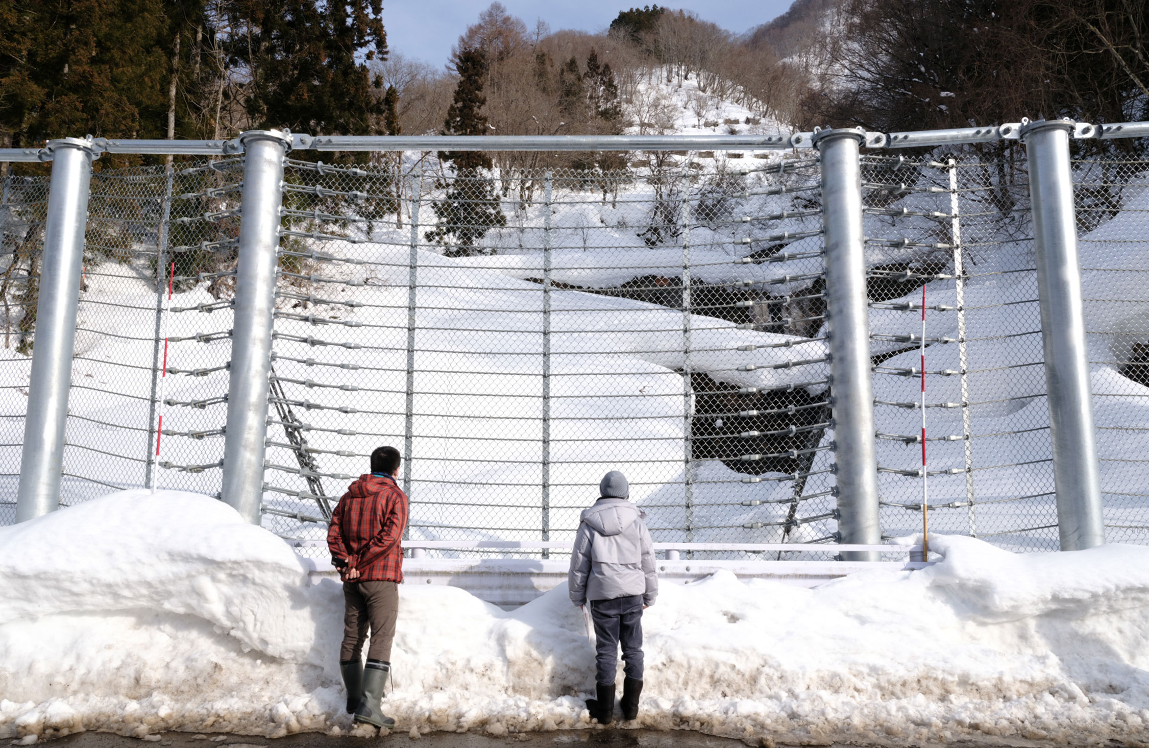 そして今日の最終目的地、同じ中谷地区の「中谷桐の木沢 雪崩防護フェンス」にたどり着いた。山間の村は、日が陰るのが早い。もうそろそろ夕刻へと近づいていた。