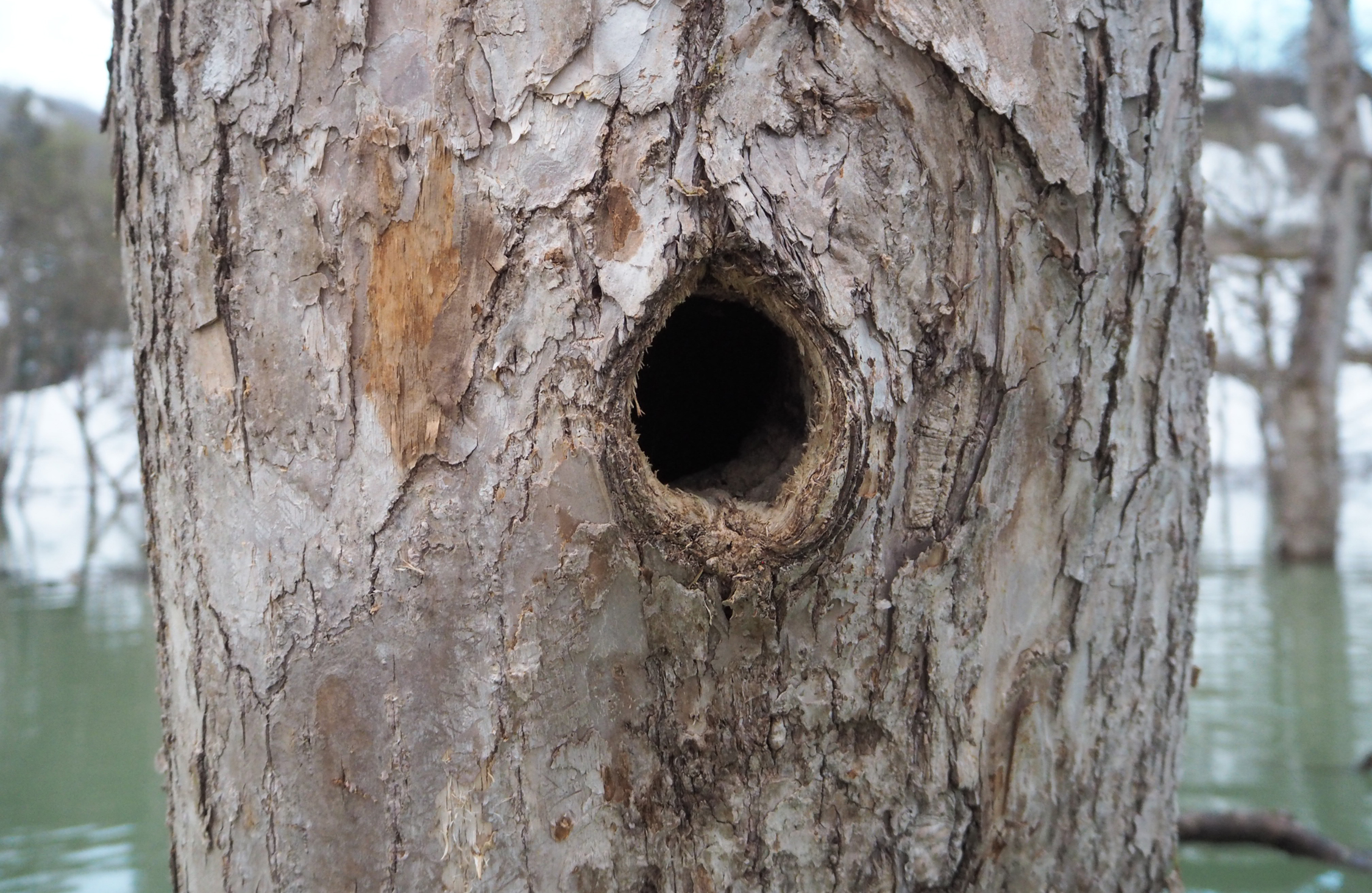 「キツツキの巣です。キツツキは地上から数メートルのところに巣を作るんですよ」