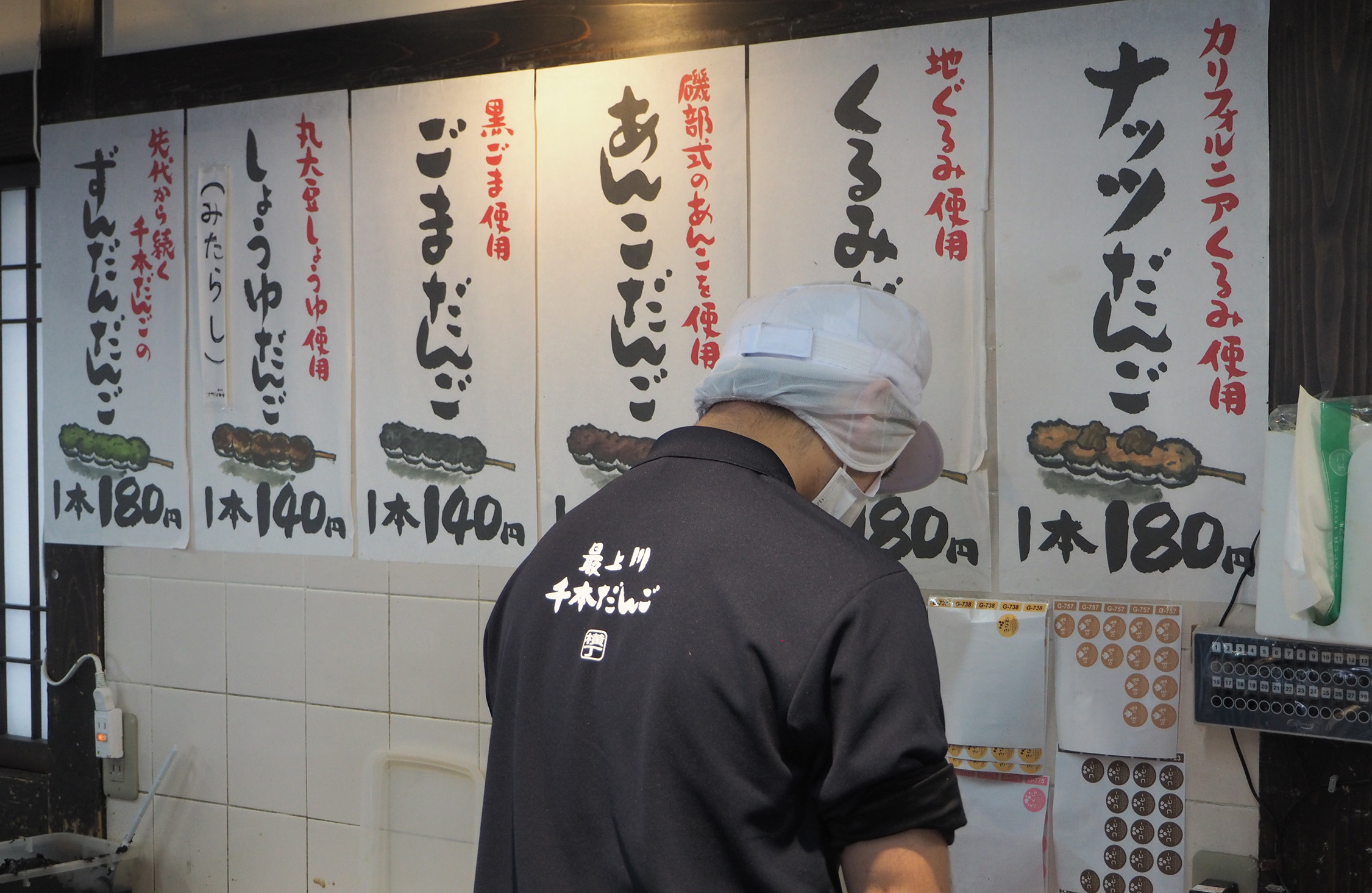 野生の勘でその危険性を察知していた僕は、取材が始まる2時間前の14時頃に到着したので、行列に並ぶことができた。レジ周りにはたくさんだんごが並んでいて、どれもおいしそうに見える。