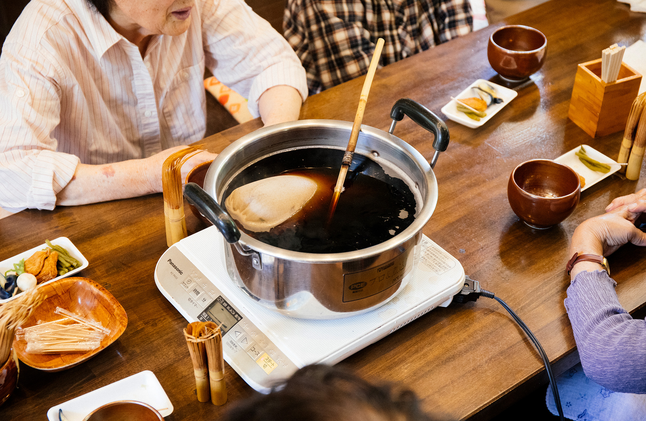 私は午後になっても、バタバタ茶を点てる人々の輪の中にいた。午前中とは面々が入れ替わり、女性ばかり10人が集まった。失礼を承知で年齢を尋ねてみると、そのほとんどが80代、90代とのこと。茶を点てながら情報交換したり相談事をしたり、噂話に花を咲かせたり。机の上に並ぶのはティーではなく黒茶、スコーンやケーキではなく漬物や煮物だが、これぞニッポンの茶会だ。ちなみに日本で流行中の「英国式アフタヌーンティー」は200年ほど前に大英帝国で誕生したものだが、蛭谷のバタバタ茶には、実にその3倍の歴史がある!