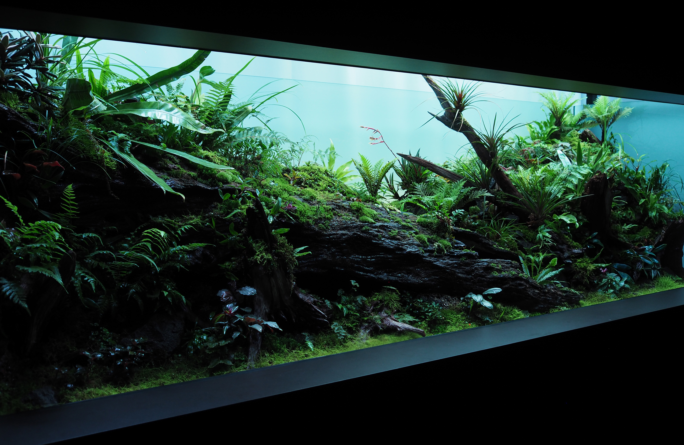 ひと際大きい、熱帯雨林を再現した水槽は「パルダリウム」と呼ぶ。幅4メートルあるこの水槽は、世界最大級。顔を近づけると、まるでかぶりつきで熱帯雨林をのぞいているようだ。