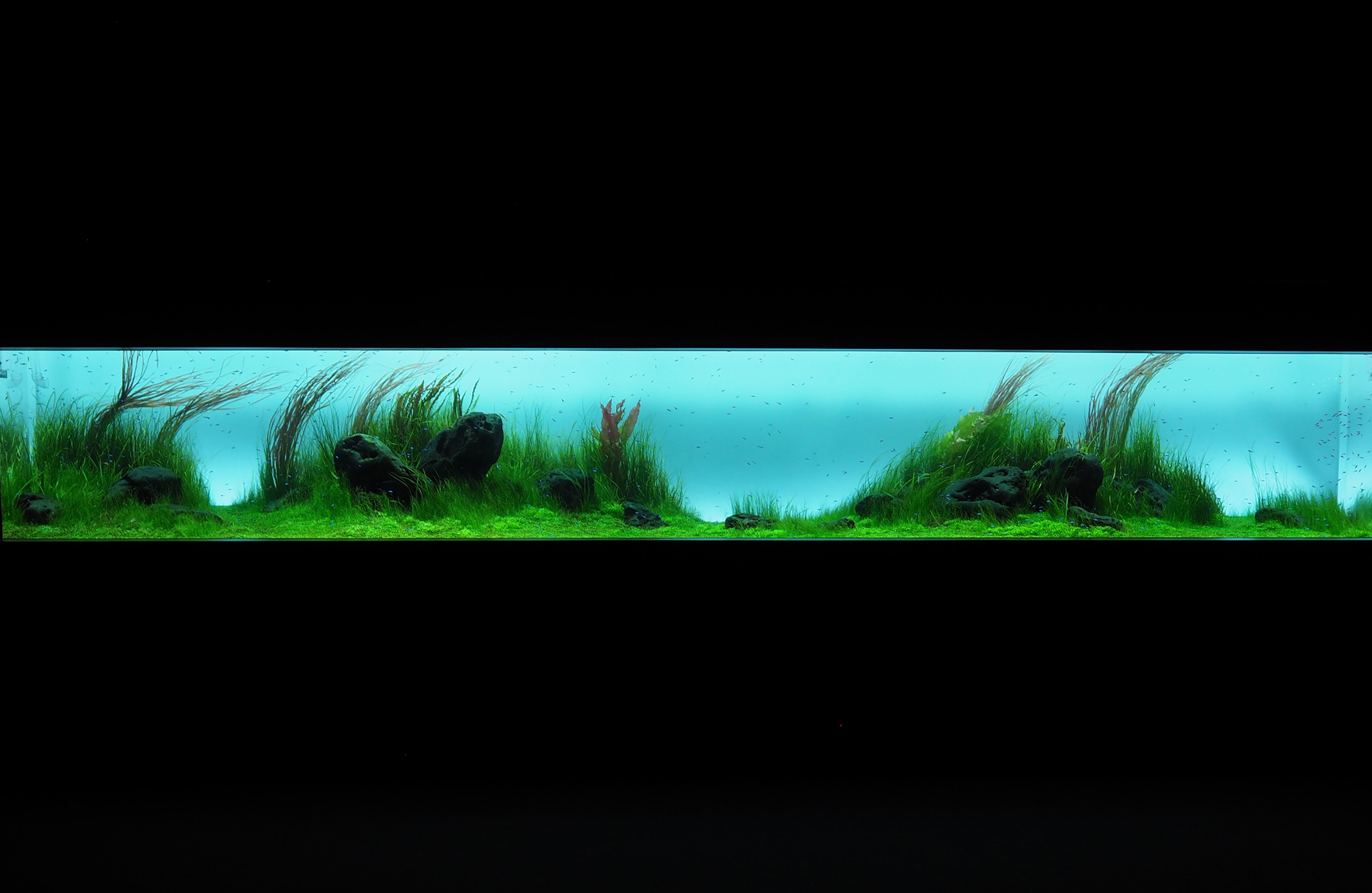エスカレーターで、アオアオ サッポロの5階に上がる。薄暗いスペースに、横長の巨大な水槽が浮かび上がる。これは、水槽のなかに自然の生態系を再現した「ネイチャーアクアリウム」という手法で、趣の異なる水槽が4つある。