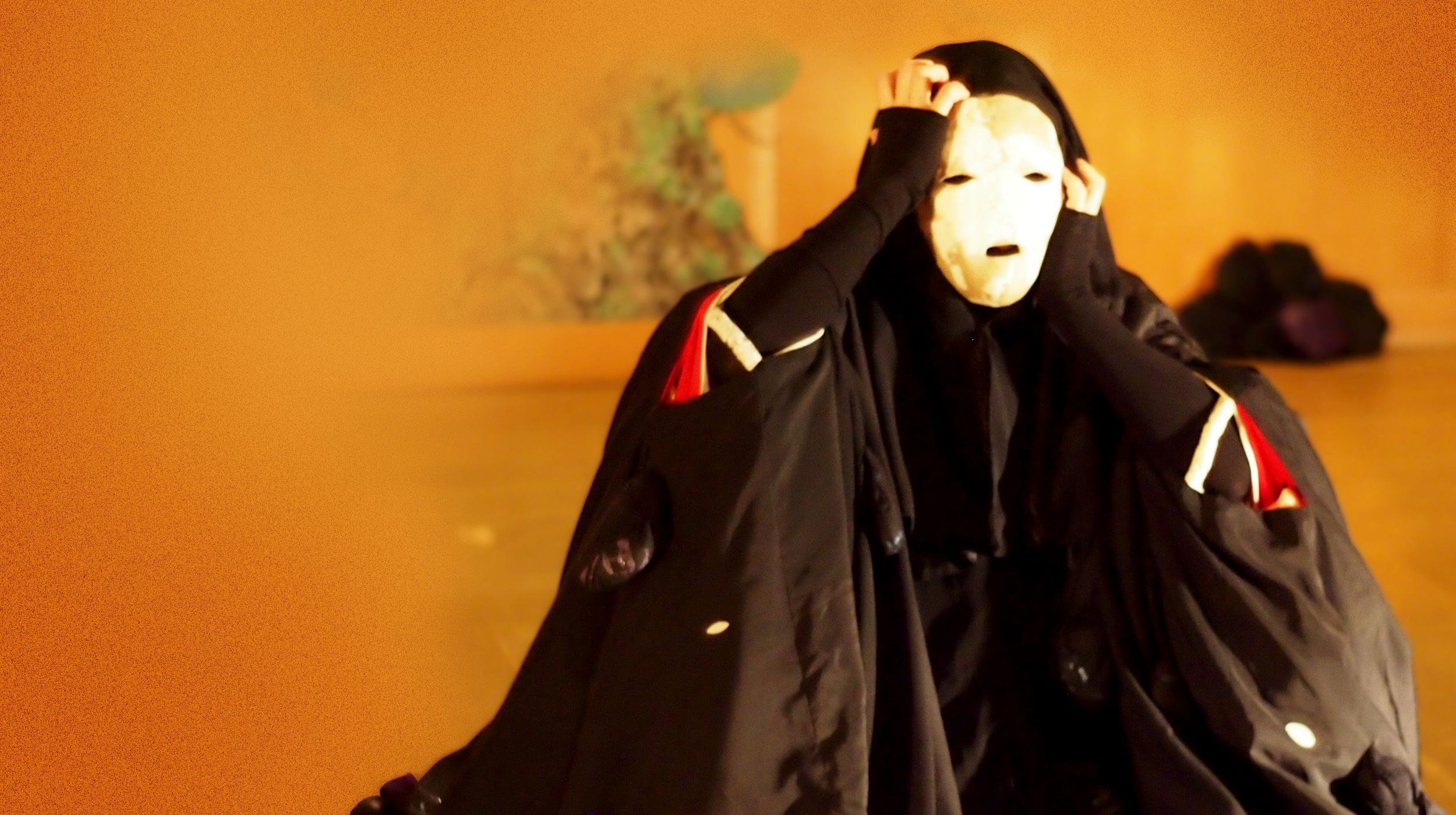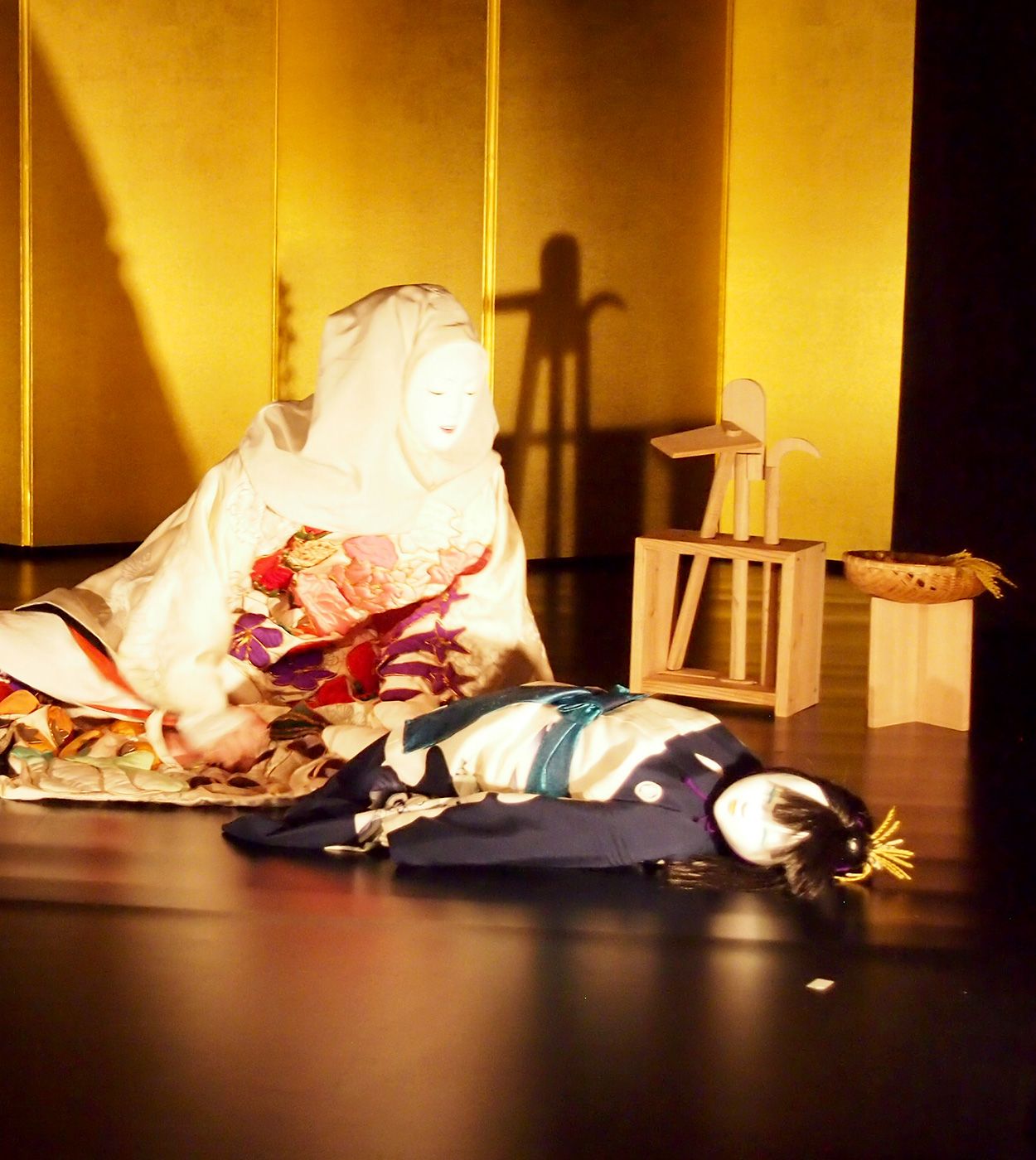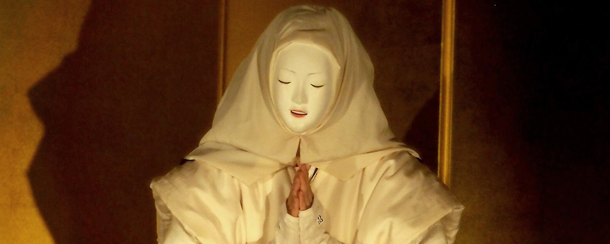 舞台上手から、全身に白装束をまとった役者が音もなく現れる。羽衣のようなものを被っている。まるで人間味のない足取りで下手側へ進む。つと正面を仰ぎ見る。その顔は、柔らかな表情をした女性のお面だった。