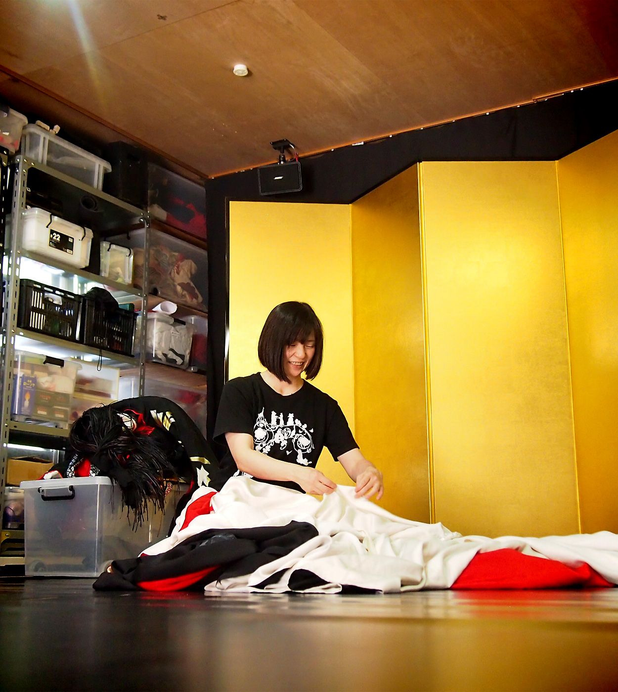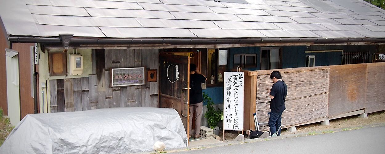 この建物は元々、飯田さんが所属していた劇団「百鬼どんどろ」の拠点として使われていたものだ。劇団の主宰者であった岡本芳一氏が2010年病気のためこの世を去ると、唯一の後継者として劇団に残っていた飯田さんが引き継ぐことになった。今年三月、稽古や公演に利用できるよう改装。看板には自身の屋号である「百鬼ゆめひな」の名を掲げた。今回の公演は、新アトリエ完成後のこけら落とし公演でもあった。
