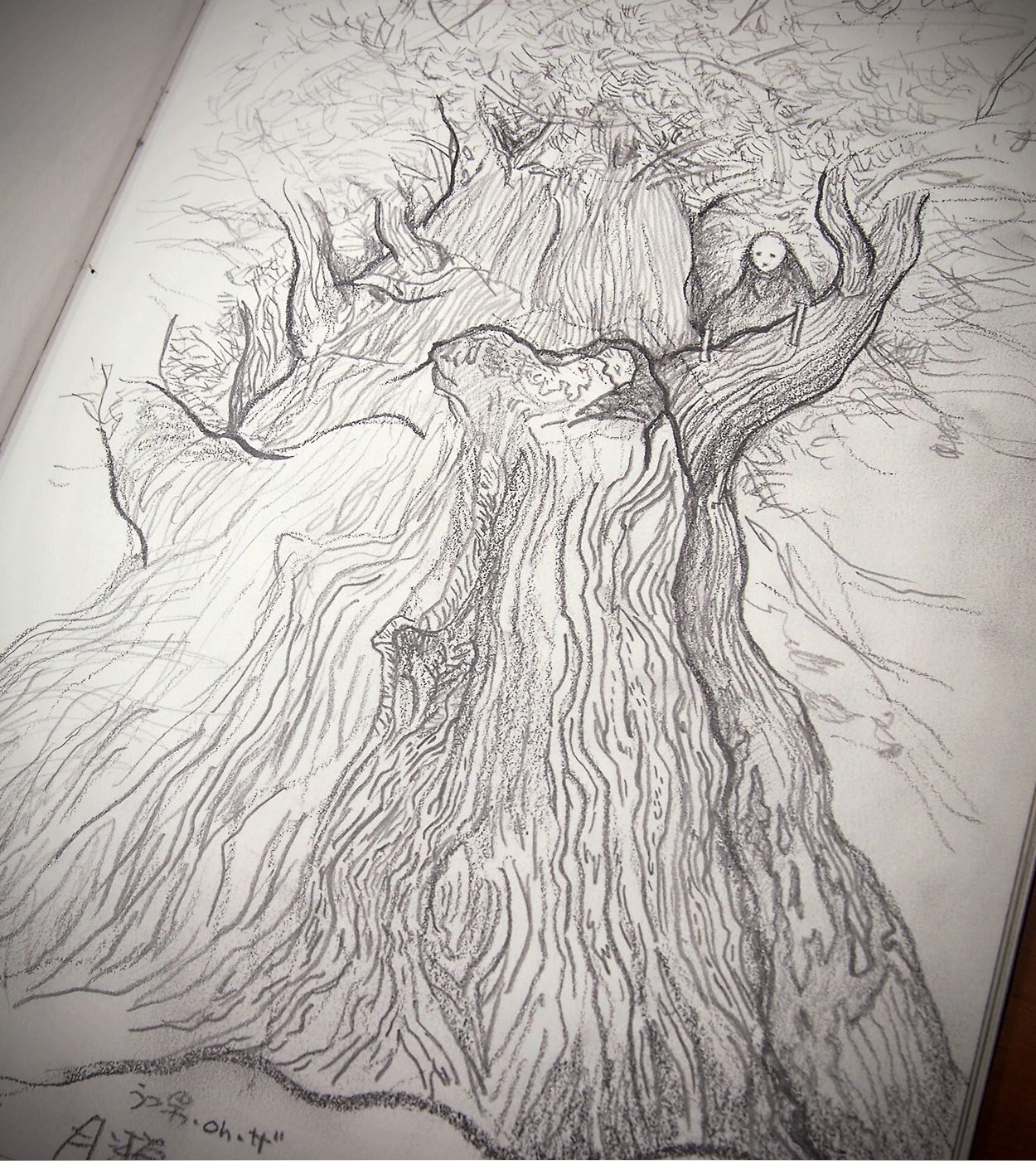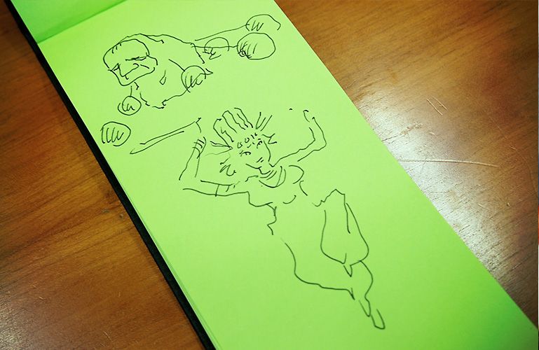 多忙な宮崎監督と会えるのは年に一度のボランティアの日のみ。会えない間、彼は自身でデッサンを描き、細かなストーリーを詰めていった。監督と会う機会ができるとそのアイデアを持っていき、修正をうける。監督からは、登場人物の姿や小道具、大切にすべき世界観まで、細やかなアドバイスがあったという。