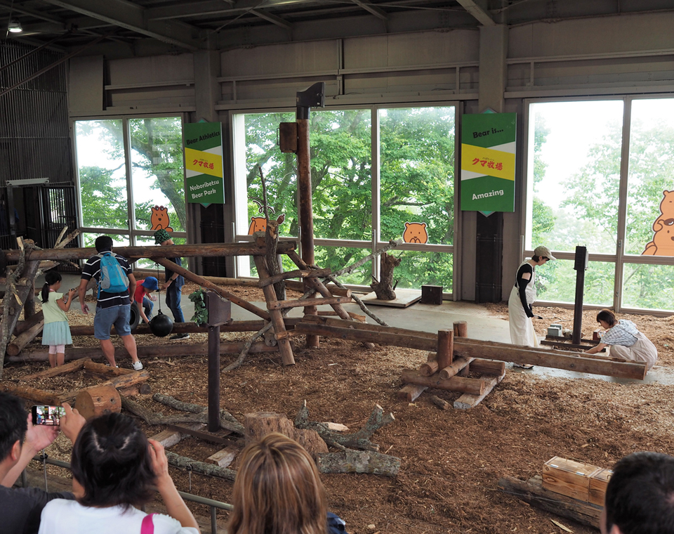 山頂駅の正面にあるのは、クマ山ステージ(クマのアスレチック)。ここでは1日2回、10時半と15時からクマのショーが行われる。10時半の回は、お客さんでいっぱい! そのなかから3組、舞台にエサを隠してクマに探してもらうという体験コーナーがあり、飼育員さんが希望者を募ると、大勢の人が手を挙げた。