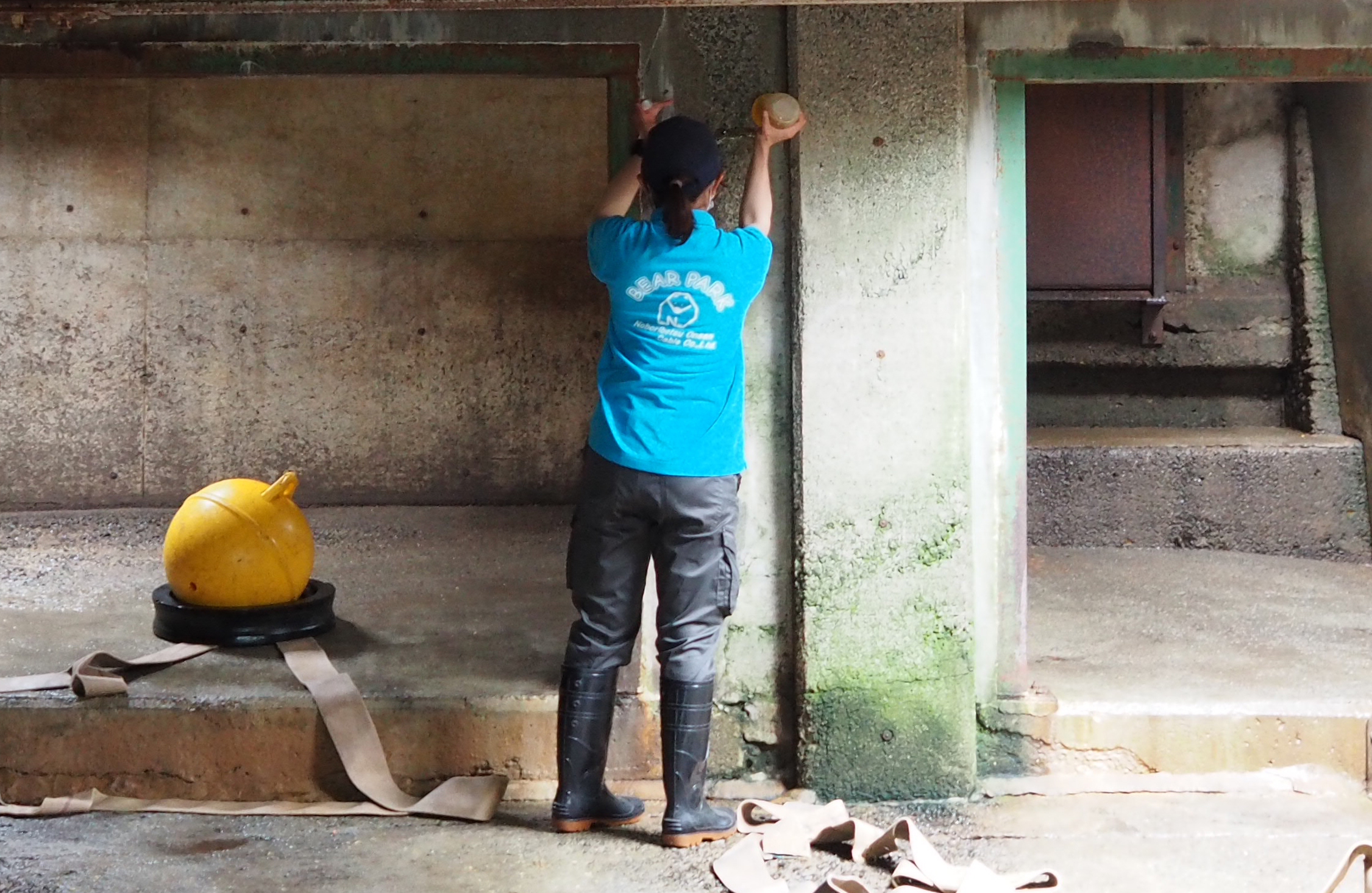 取材の日、特別に獣舎を見せてもらった。飼育員さんがタイヤの内側や浮き球のなかにエサを詰め、壁の高い位置にハチミツをつける。その匂いを感じていたのか、展示場から勢いよく戻ってきたクマたちは、一直線に浮き球とタイヤに向かい、エサを取り出そうと動き始めた。ハチミツが好きなクマは、立ち上がって壁を舐めている。エサの時間ながら遊んでいるようでもあり、こういった工夫があるのとないのとでは、クマの時間の過ごし方はだいぶ違うのだろうと実感した。