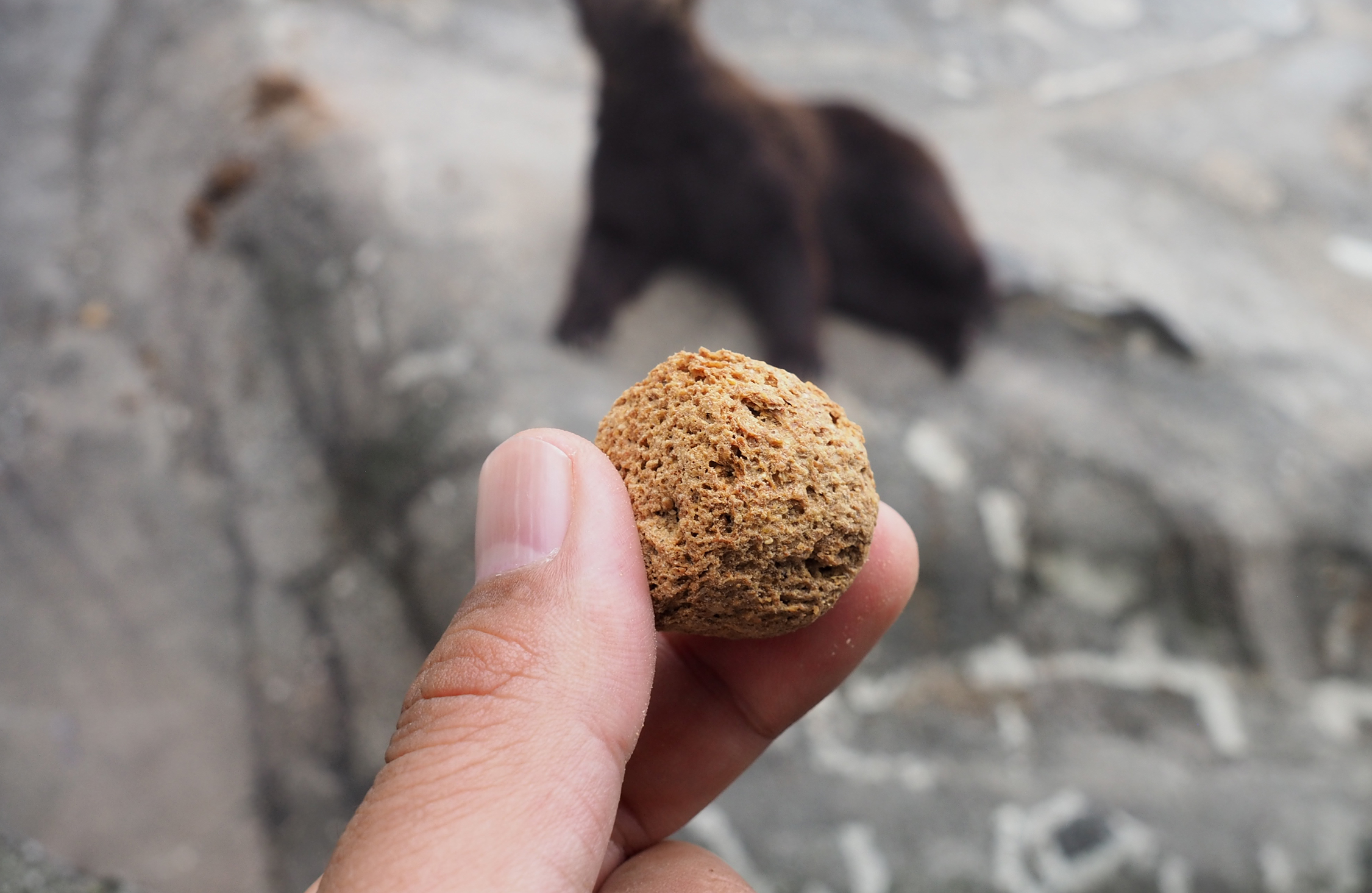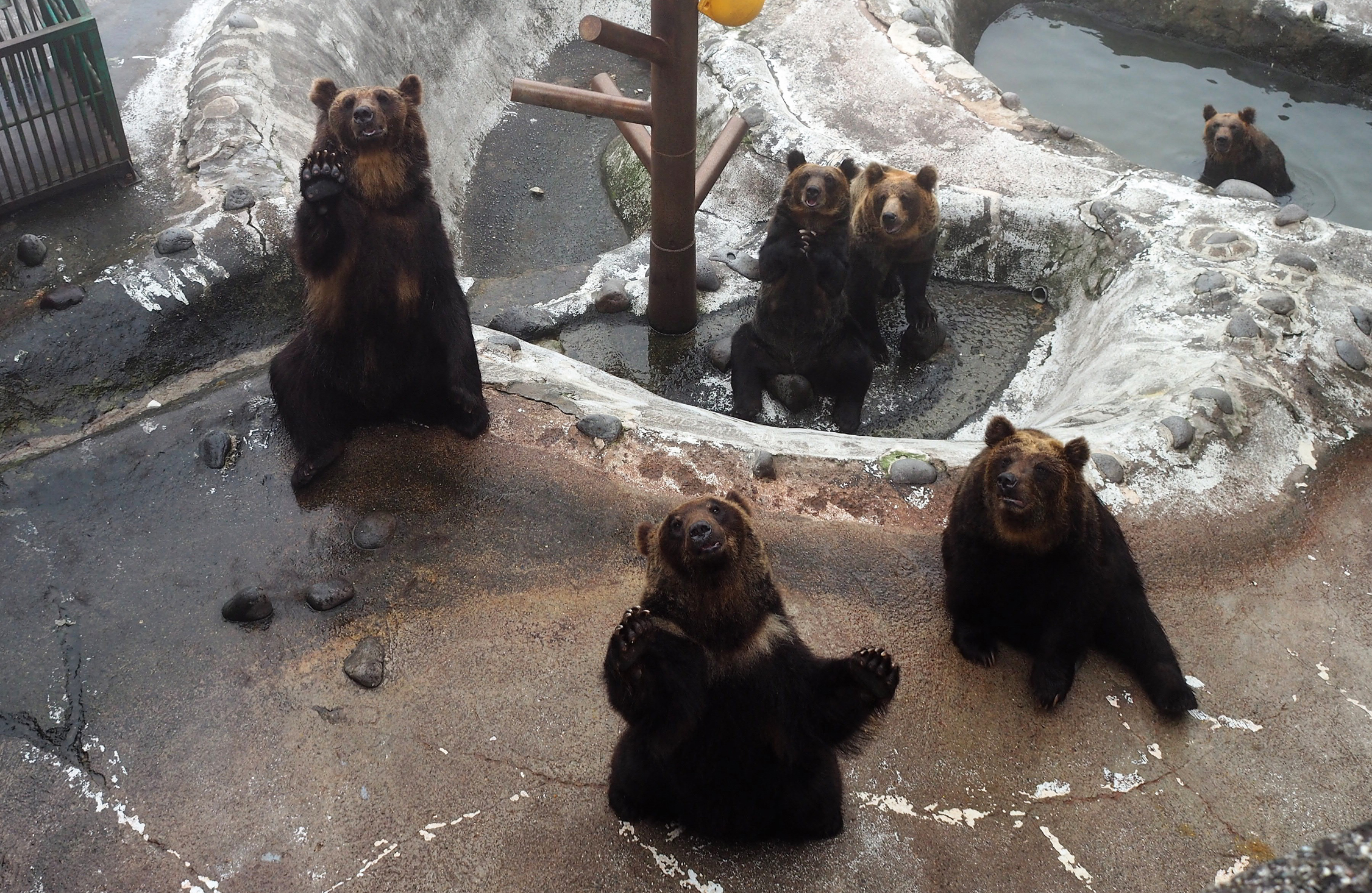 吉見さんの話を聞いた後、オスが集まる第1牧場とメスが集まる第2牧場に向かった。自動販売機でエサが売られていて、それを買うと投げ入れることができる。クマたちは、お客さんたちに向かって手を上げたり、口を開けたり、おねだりに忙しい。僕も吉見さんからエサをもらって、投げてみた。