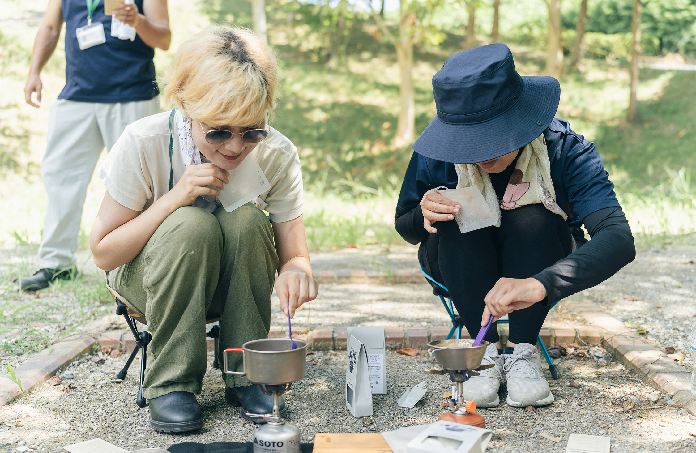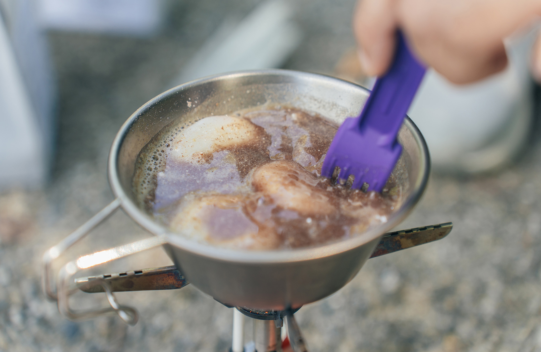 アウトドア用のバーナーにシェラカップを置いて、商品開発中のしんこもちのお汁粉を温めて食べるおまけ付きだった。