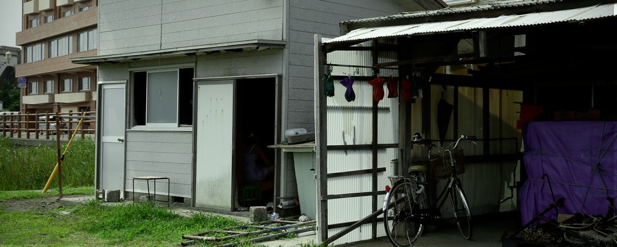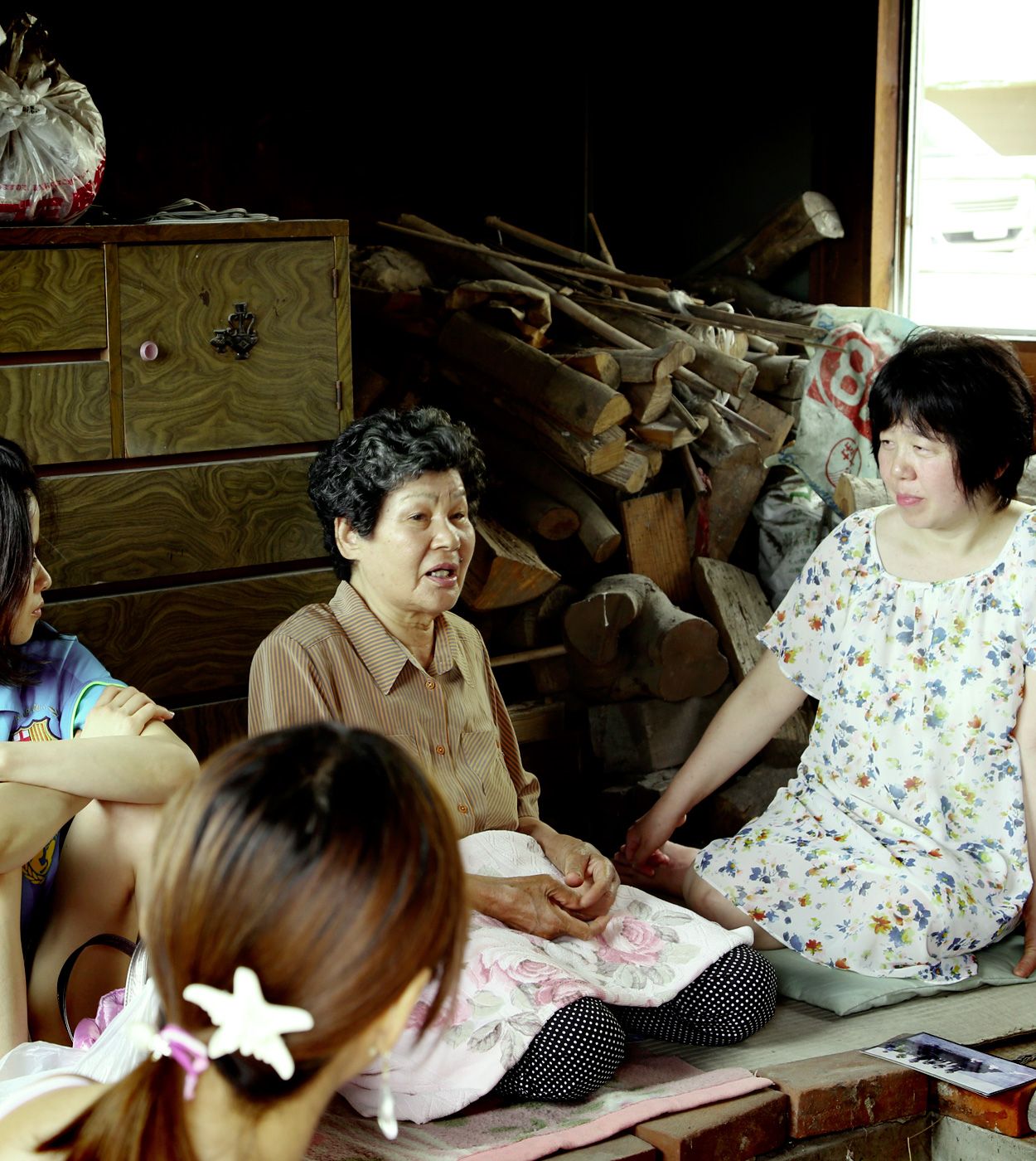 中に入ると中央には囲炉裏があり、その周囲の畳の床には座布団代わりであろう古い毛布が敷き詰められている。木製のたんすが置いてあり、横にはたくさんの木の枝が積み上げられている。室内の壁はつぎはぎだらけで、見上げると古びた洗濯バサミが吊るしてあった。その奥に年配の女性がひとり座っている。