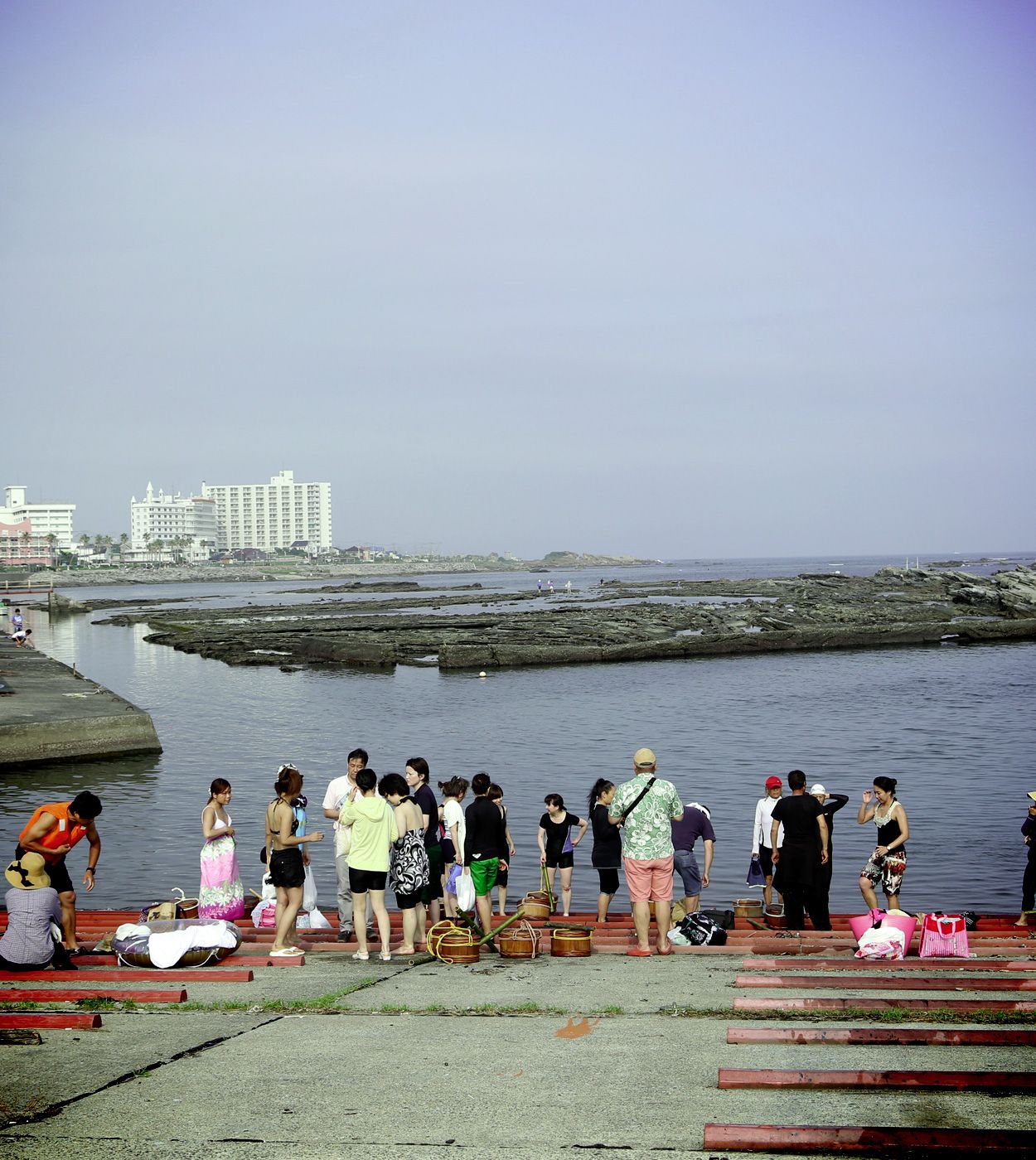 海面への入り口はコンクリートの坂になっていた。参加者は列を作ってひとりずつ坂を下り、水に浸かる。私は運良く列の後ろの方につけたので、先に入水するメンバーの様子をうかがうことにした。