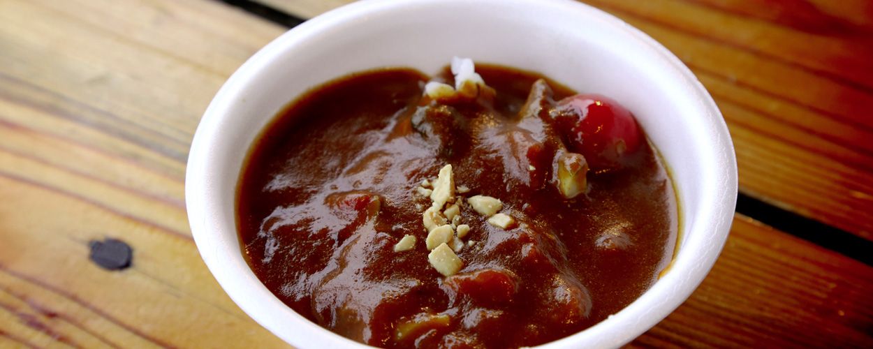 「海で仕事を終えた海女さん達が、冷えたカラダと心も温めるカレー」をテーマに作られた、サザエやアワビなど海の幸をふんだんに使ったカレーは、お椀サイズのカップで一皿300円で食べることができる。提供店の軒先には、このテントにあるのと同じ旗が立っているということだった。